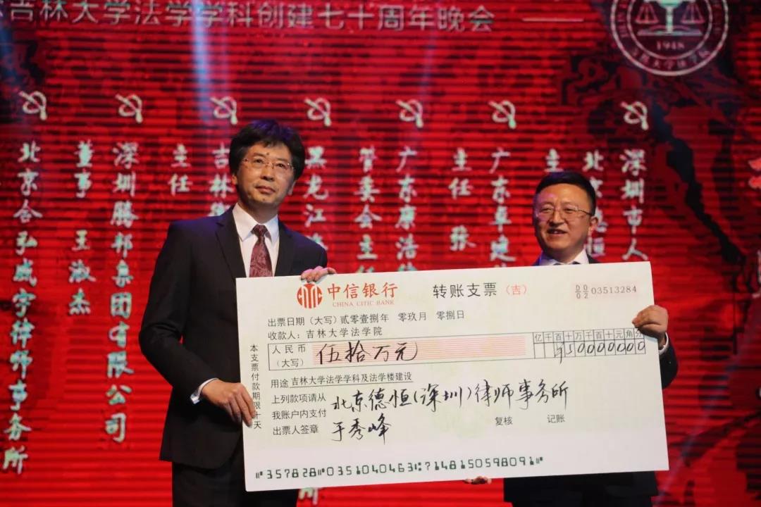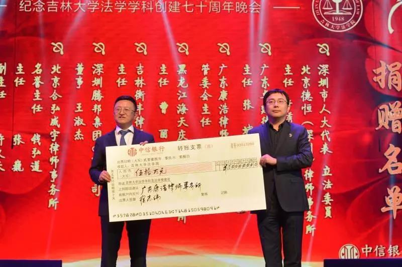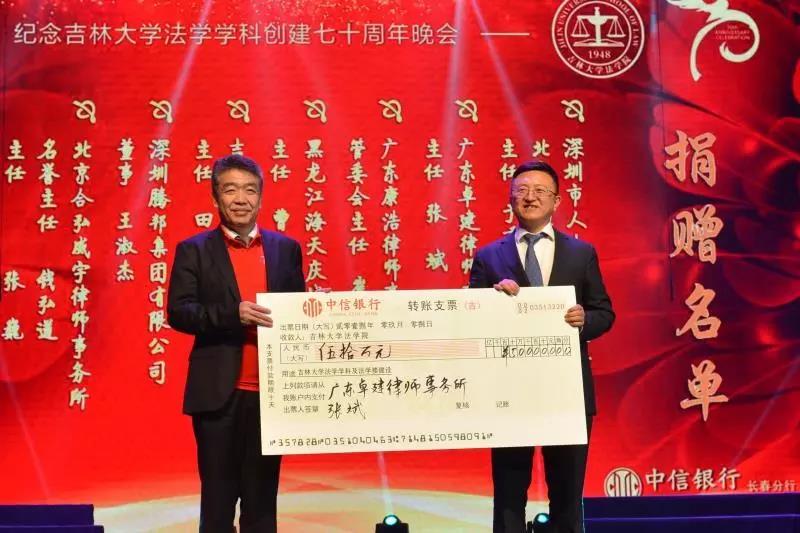 70年来,吉大法学培养了一批又一批优秀的法律人才,他们走出母校,在社会的大熔炉中历练、成长。在此70周年庆典之际,他们又回到了母校,为学院的发展建设献出自己的力量:深圳市人大代表、立法委员、北京德恒(深圳)律师事务所主任:于秀峰个人捐赠50万元;广东卓建律师事务所捐赠50万元;广东康浩律师事务所捐赠50万元;黑龙江海天庆城律师事务所捐赠50万元;吉林衡丰律师事务所捐赠50万元;深圳腾邦集团有限公司捐赠100万元;北京合弘威宇律师事务所捐赠100万元;北京金杜律师事务所捐赠800万元。感谢各位校友对吉大TheGay