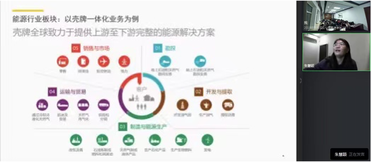 一、演变中的能源行业——不同视角、不同含义、不确定性、革新与颠覆。在这部分中,朱总经理援用详实的数据分析了能源转型的定义、动因与趋势、转型的周期、成功转型的要素和国际上通行的政策框架。她特别提到了在传统能源长期依赖进口及其严重污染环境的背景下,实现清洁能源替代对我国的能源安全和能源战略的重要意义,同时结合我国的双碳目标向同学们展示了我国清洁低碳化的绿色能源政策的推进思路与实现路径。