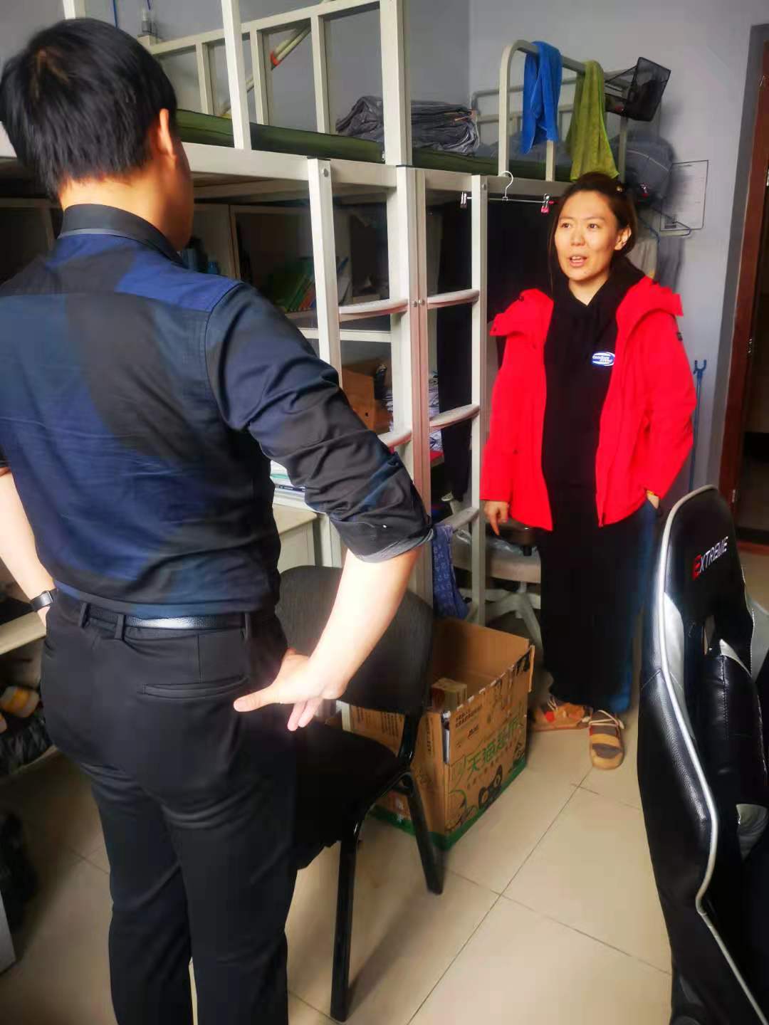 研究生辅导员郑诺在学院同学们的陪同下走访了南八、南六公寓学生寝室。