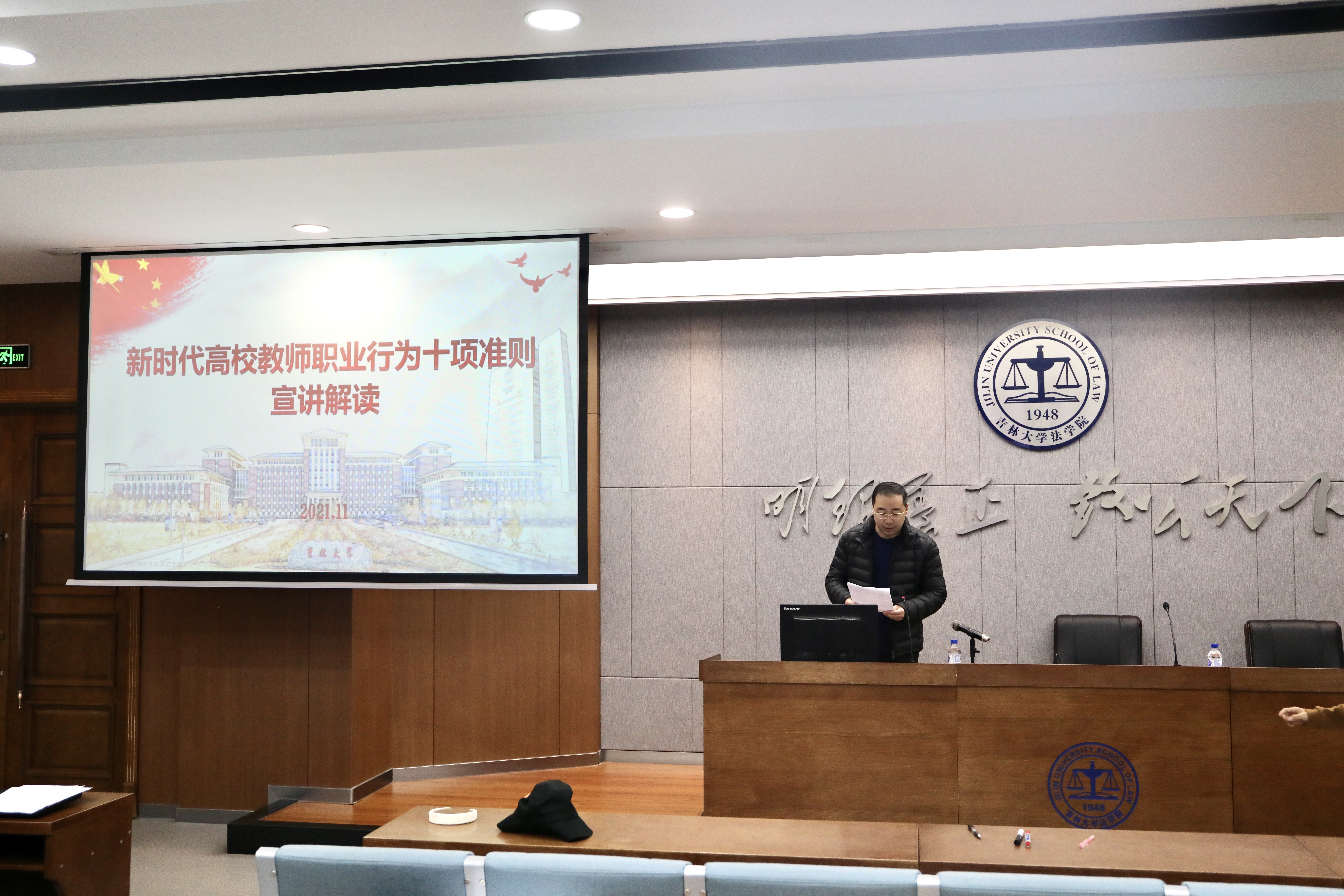 于11月10日下午,在东荣大厦B313教室组织召开全院教职工大会,吕欣副院长和张俊峰副书记分别就高校教师十项准则,党的民族政策、宗教政策和相关法律法规进行宣讲解读。