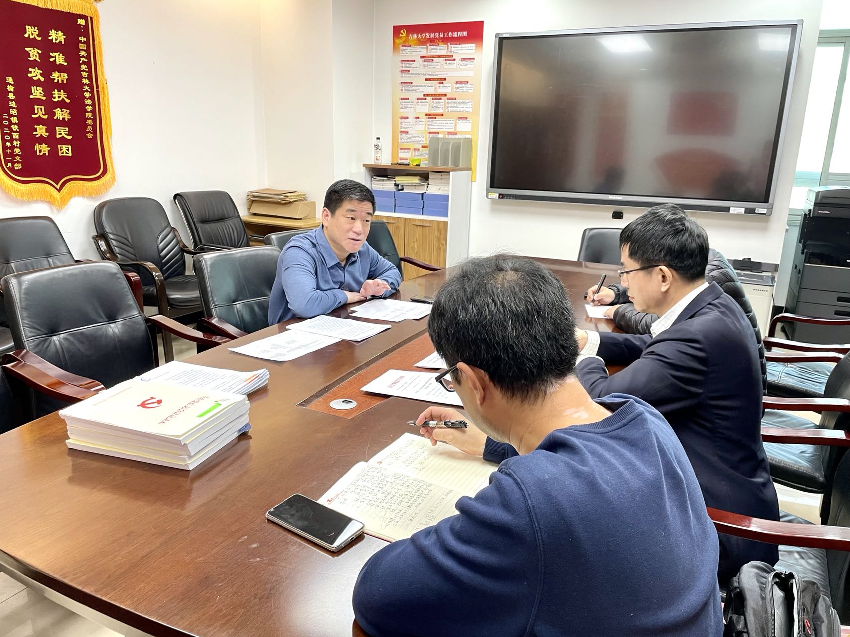 院党委书记周春国向督导组汇报了法学院按照学校要求开展党史学习教育工作的整体落实情况,并重点介绍了学院在党史学习教育工作中的亮点和短板。
