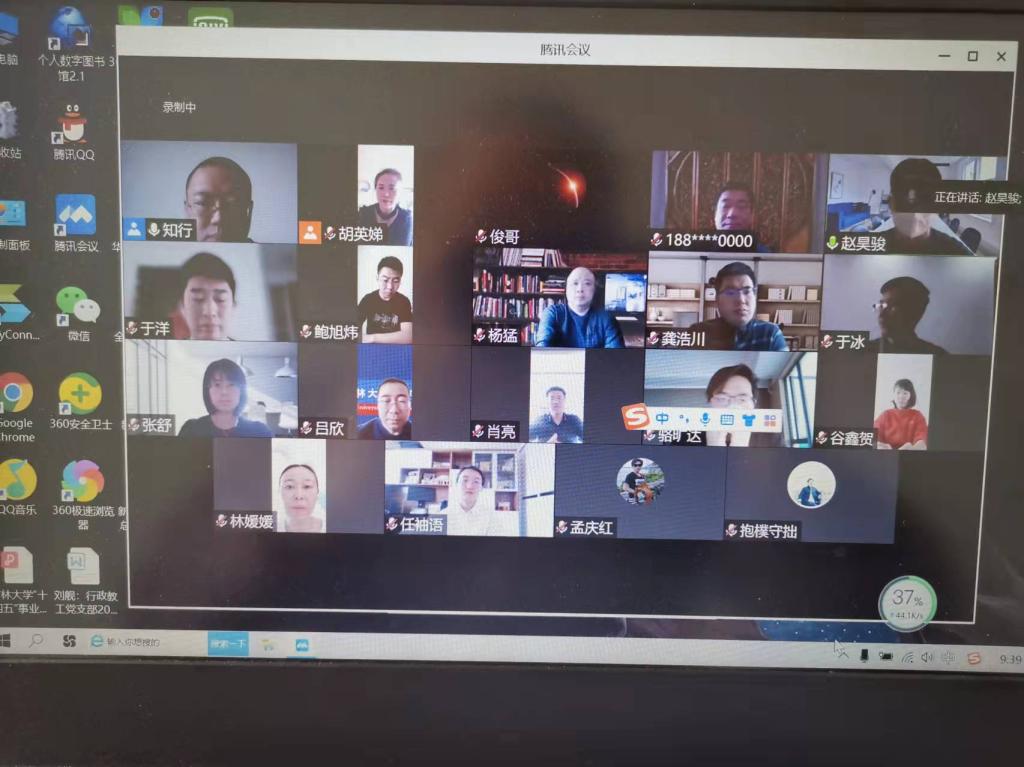张俊峰和辅导员赵昊骏在校园封闭管理伊始就驻校开展疫情防控工作。他们分别介绍了学院在校研究生和本科生的学习、生活、心理健康等情况,对学生们乐观向上的精神状态、有条不紊的学习生活和抗疫志愿者们的出色工作表示了极大的肯定,对组织开展的富有学院特色的“同心抗疫,共克时艰——研究生抗疫情”系列活动和“‘吉’心协力——法苑志愿者行动”系列活动进行了介绍。学院校友联络服务中心主任胡英娣汇报了疫情发生以来院长何志鹏、书记周春国和多位教师回应各地校友关切、与各地校友联系的大量辛苦工作,对各地校友给予母校师生的关心关爱和捐赠的各类物资等情况进行了详细介绍。其他各位党员对个人居家期间的工作、学习和生活情况进行了介绍,分享了居家办公以来对工作和职责的思考,分享了学院抗疫中涌现的先进人物、典型事迹和感人故事。大家都纷纷表示,随时准备听候学校和学院召唤,奔赴抗疫工作第一线。
