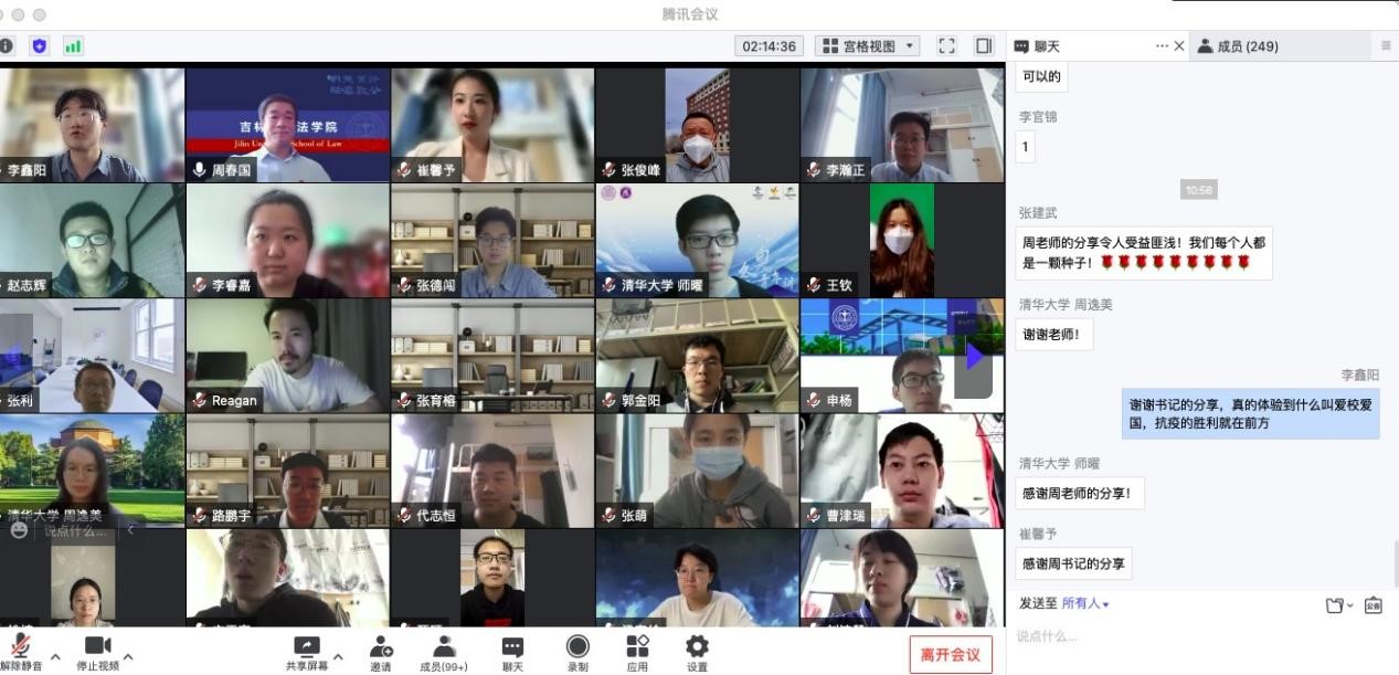 联合清华大学博士生讲师团在腾讯会议举行“云端战疫”思政课,对疫情期间涌现的广大志愿者的先进事迹和精神进行凝练总结。院党委书记周春国、党委副书记张俊峰、研究生辅导员徐晋、于洋,以及TheGay