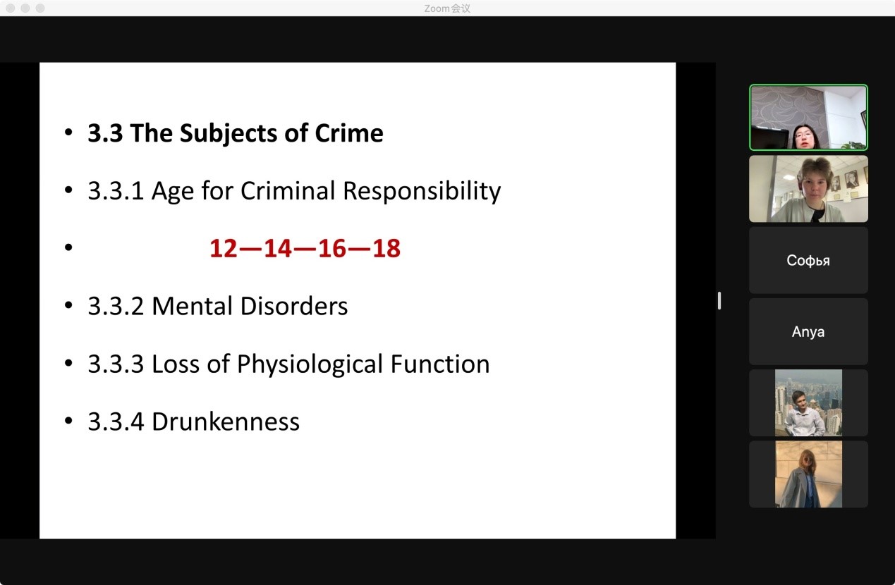 李海滢教授向圣彼得堡国立大学法律系的学生介绍了中国刑法的渊源、发展、体系与解释,解读了中国刑法学中的四要件犯罪构成理论,分析了两类法定正当行为既正当防卫与紧急避险的成立条件,包括对防卫过当、特殊防卫、避险过当的理解,同时系统介绍了中国的刑罚体系,特别是在限制死刑适用方面的制度设计。李海滢教授的授课注重理论阐释与案例分析相结合,通过深入浅出、具体生动的讲解,让外国学生更好地了解了中国刑法学的基础理论知识、中国刑法的基本规定和刑事司法的实践做法。