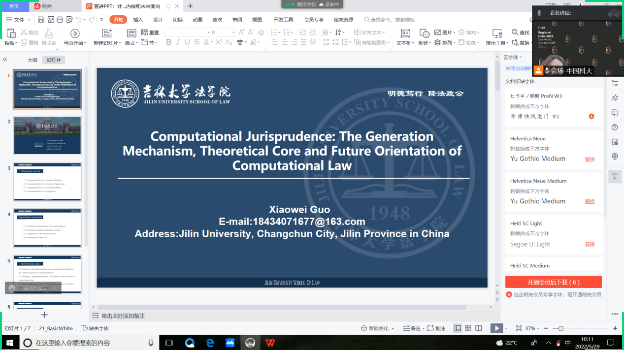 2021级法学理论专业硕士研究生郭小伟同学,以“Computational Jurisprudence: The Generation Mechanism, Theoretical Core and Future Orientation of Computational Law”为题,应邀以Poster形式在“Computational social sciences issues”专题中作演讲,和与会者展开讨论。郭小伟同学以其长期担任清华大学智能法治研究院研究助理的实践经历,结合其自身所学专业从法学理论的视角对计算法学的生成机理、理论内核和未来面向作了详细报告。