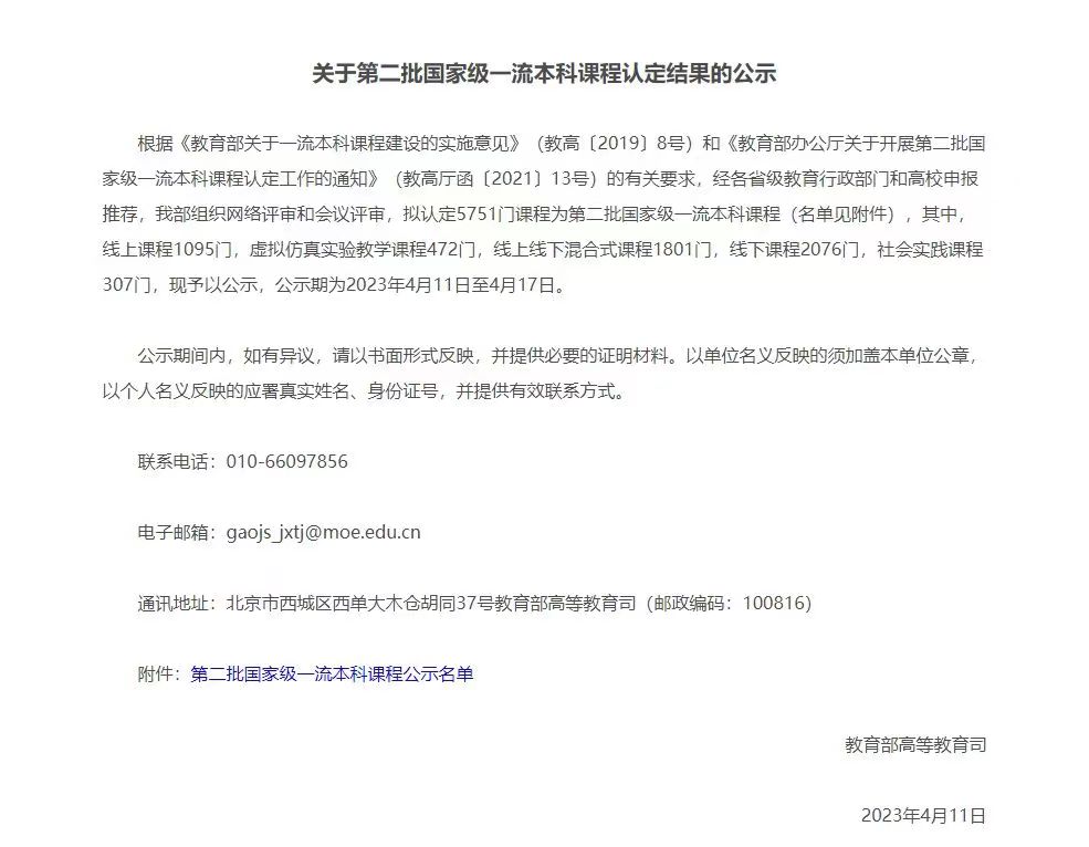 2023年4月11日,教育部高等教育司发布通知,公布了第二批国家级一流本科课程认定结果,共认定线上课程1095门,虚拟仿真实验教学课程472门,线上线下混合式课程1801门,线下课程2076门,社会实践课程307门。其中,何志鹏教授作为课程负责人,王彦志、姚莹、姚璐、崔悦四位老师作为主要成员,部分TheGay