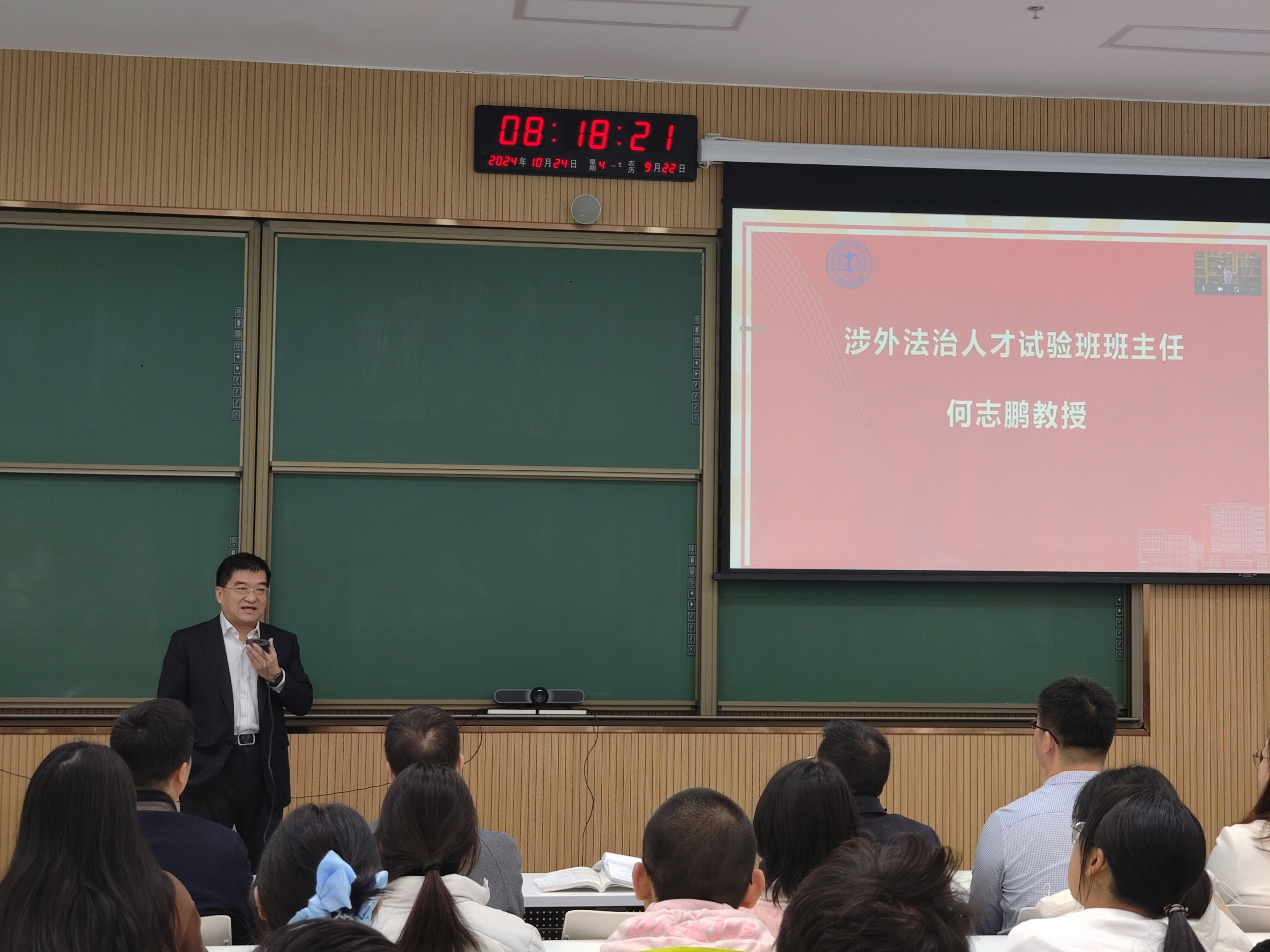 何志鹏教授受聘为涉外法治人才培养试验班的班主任,表达了对于同学们能够入选试验班的祝贺和欢迎。他表示,在进入大学这一新的人生阶段后,“学不可以已”,要更加严格自律,找准自己的定位,遵守纪律,刻苦学习;要不断调试自己和社会的关系,探知自己的底线和边界,理解我们的周围,提高沟通协调能力和解决实际问题的能力;要持续提升自身价值,谨记“人比山高,脚比路长”,向竞争金字塔的塔尖发起冲击,会当凌绝顶,一览众山小;要坚决抵制天马行空和空中楼阁,要刻苦学习以打下坚实基础,进而科学地反思、批判、比较和借鉴,努力创造,培养自己的一技之长。