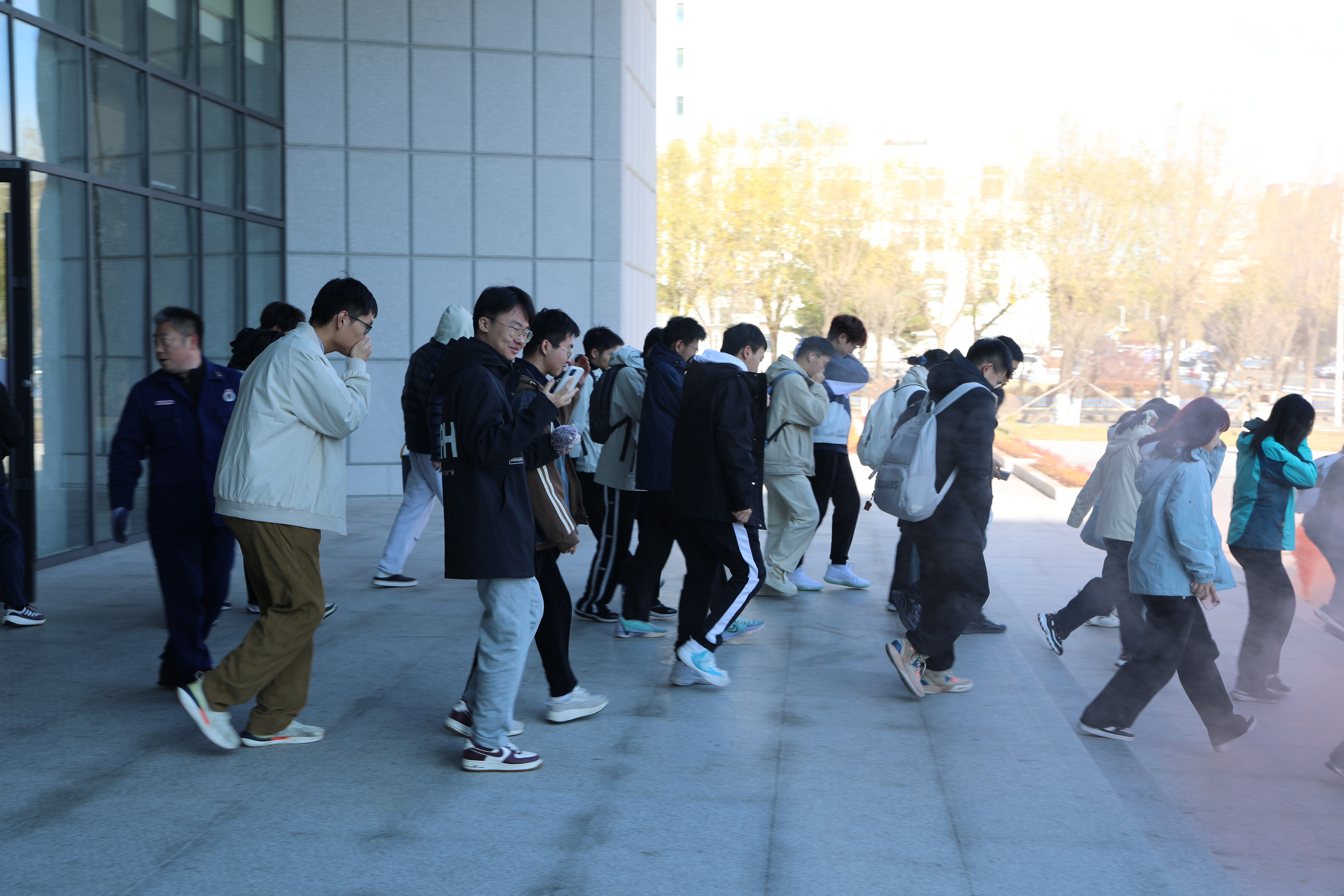 随着警报声的响起,现场滚滚浓烟,在学院老师和物业工作人员的指引下,全楼师生按照安全出口所示的方向,从楼内稳中有序迅速疏散至楼外安全地带。