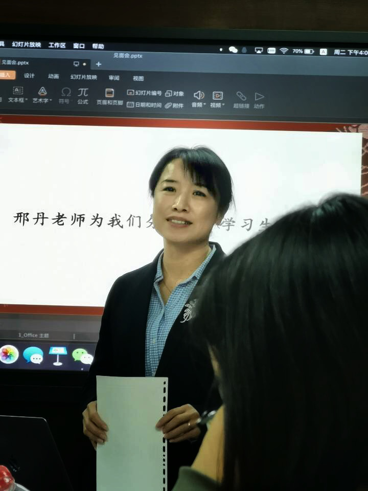 见面会开始,二班班长黄冠华同学介绍了二班的基本概况,通过PPT展示了二班融洽温馨的班风班貌。随后,介绍两位班主任老师丰富的教学、任职经历,使同学们对老师有了详细的了解,同学们用鲜花表达对老师出任导师、班主任的感谢。