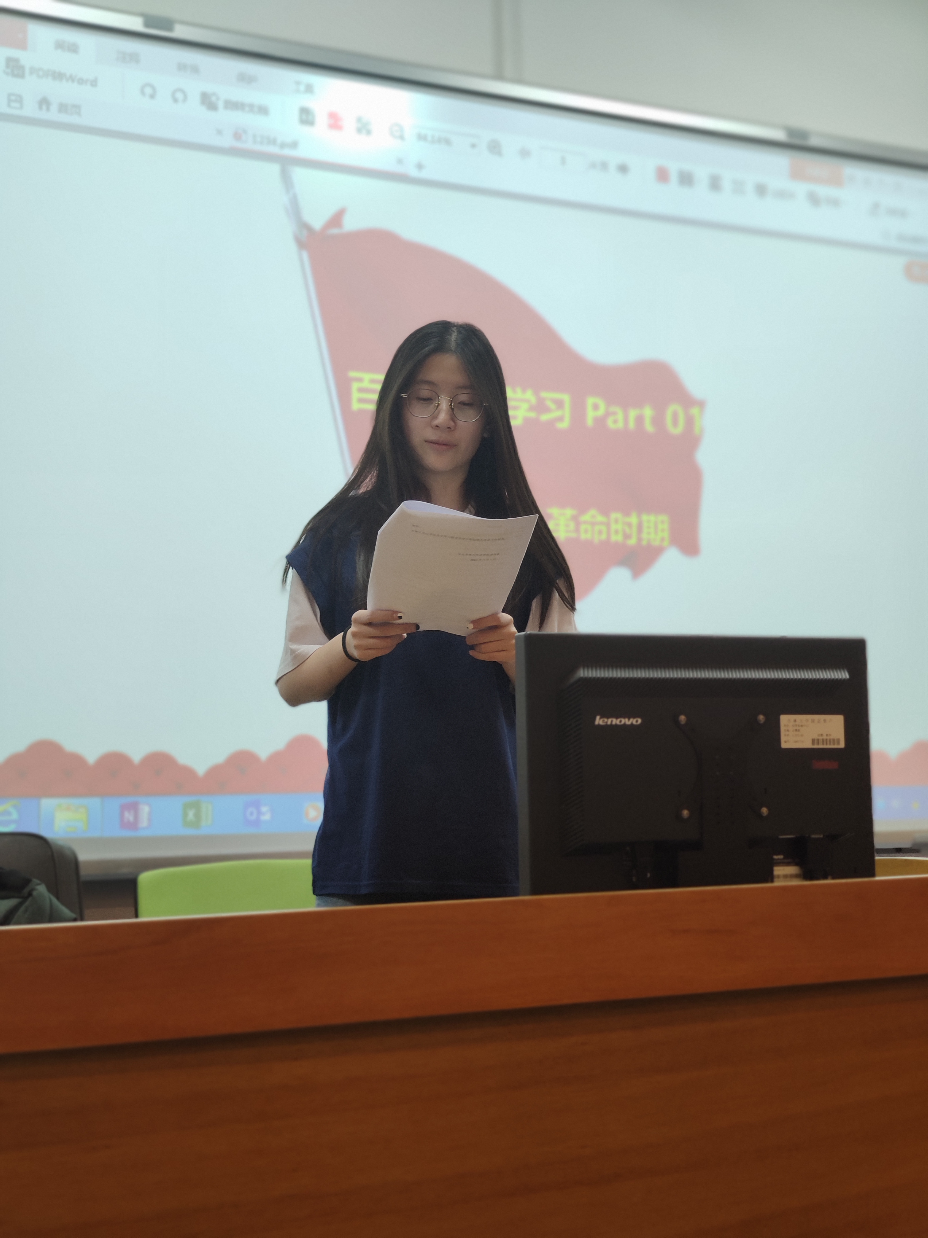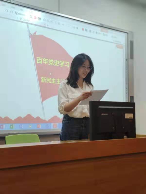党员郭香玲向就1919—1924年的党史进行了发言,并结合所学内容指出:“青年学生的爱国热忱,以及革命先烈用生命燃起的照破国家昏暗年代的光。创业维艰,筚路蓝缕,我辈应继续为中华民族伟大复兴事业贡献力量。”