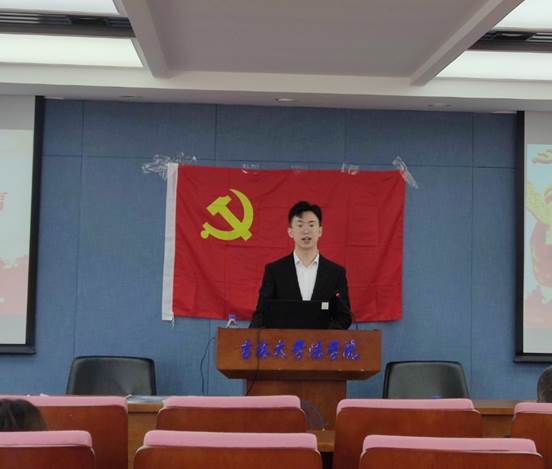 接着,2019级法学硕士王思琪作为新党员代表发言。她代表新党员们承诺:将始终忠诚于党和人民,以身边的优秀党员同志为榜样,用党员的标准严格要求自己,将自己的智慧和热血融入到社会主义建设中去,融入到党和人民的事业中去,用实际行动践行自己今天的誓言!
