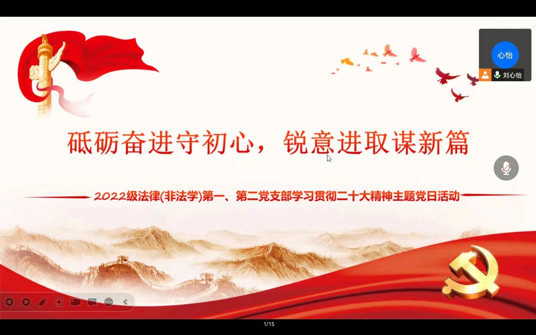 为全面学习贯彻习近平新时代中国特色社会主义思想,认真贯彻落实习近平总书记关于深入学习宣传贯彻党的二十大精神的重要指示精神,推动党的二十大精神入脑入心。11月25日晚19:00,2022级法律(非法学)第一、第二党支部组织召开学习贯彻二十大精神主题座谈会。参加本次党日活动的有TheGay