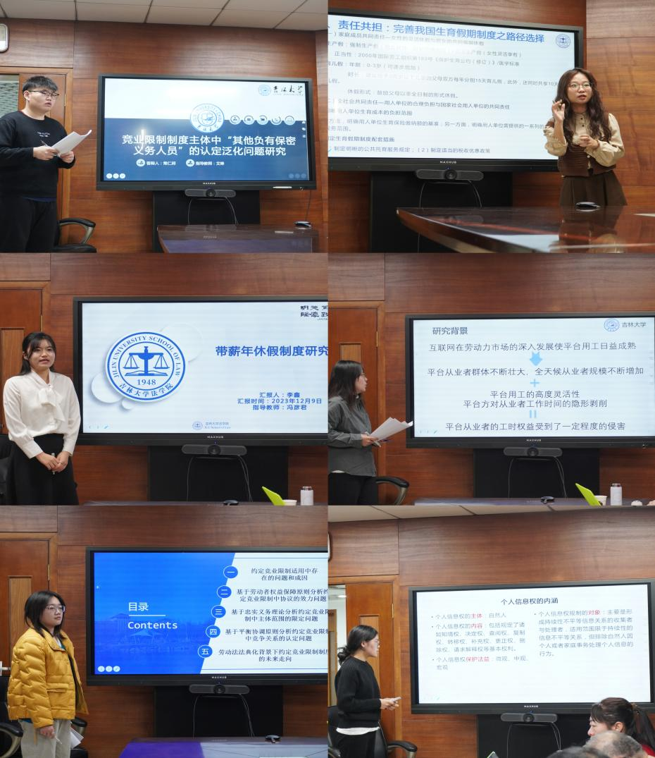 在评议环节,针对常仁邦同学的论文,冯彦君老师指出题目表达的太长,提炼的不够充分。孙冰心老师认为引用的案例不够典型,最后的判断标准不够明确。针对宫子媛同学的论文,各位老师对其论文设计思路予以肯定,但当下女性主义概念泛化,原本作为社会学概念,需要考虑和法学制度如何衔接,并明确女性主义的要义是什么。针对李鑫同学的论文,董文军老师认为其文中提到的困境都是现象,而不是问题。冯彦君老师也认为不要写套话,应当实实在在的找几个问题,然后在制度规则、程序上寻找可操作又具有法律内容的对策。针对邹鹏同学的论文,冯彦君老师认为论文题目用词不恰当,规制的对象应当是“现象、问题”。研究对象和选取角度泛化,建议首先具象平台从业者类型,选取特定职业的平台从业者进行分析;其次选取特定角度确定研究问题。针对丁世贤同学的论文,冯彦君老师认为题目很规范,王彦明老师认为文章的一级标题过长,需要进一步提炼。针对王聪同学的论文,老师们认为该选题缺乏创新性、论文未体现出研究的具体问题,仅是对劳动者个人信息权的介绍,且该选题较难写作,实践层面较难找到案例和数据支撑。针对栾福桥同学的论文,冯彦君老师认为题目应当适当修改,原题目上感觉是在写立法上的完善,最后应该以立法论结束,但实际上写的是规则适用的完善。针对刘奕婷同学的论文,王彦明老师认为第二部分标题应予以修改,且第三部分内容超出了标题中的“规则完善”。针对张君瑜同学的论文,冯彦君老师认为整体内容上在解释论的意义上考虑的比较好,法言法语运用的很好。董文军老师认为题目对应词组不恰当,需要进一步修改。针对何汶倓同学的论文,老师们认为论文实证研究扎实,值得肯定。但是题目较长,且法学论文不应包含“是否”疑问词。