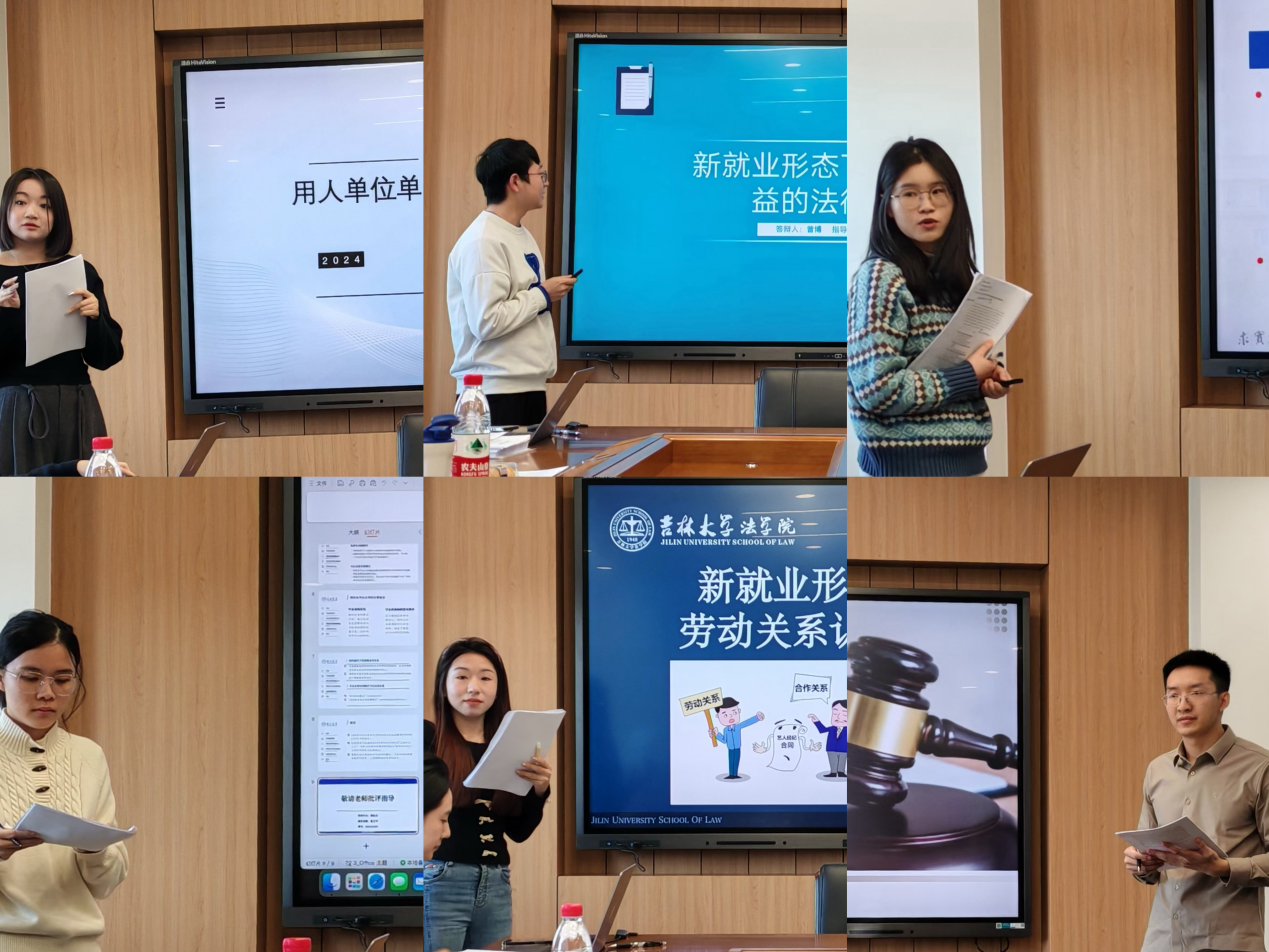 陈佳同学以“用人单位单方调职行为法律规制研究”为题,曾博同学以“新就业形态下劳动者权益的法律保护”为题,朱静静同学以“数字时代新业态劳动者权益保障研究”为题,黎易文同学以“网约车平台与司机法律关系的认定”为题,王溯源同学以“新就业形态下网络主播劳动关系认定的实证分析”为题,钟杰同学以“我国加班费争议案件证明责任分配研究”为题进行汇报。