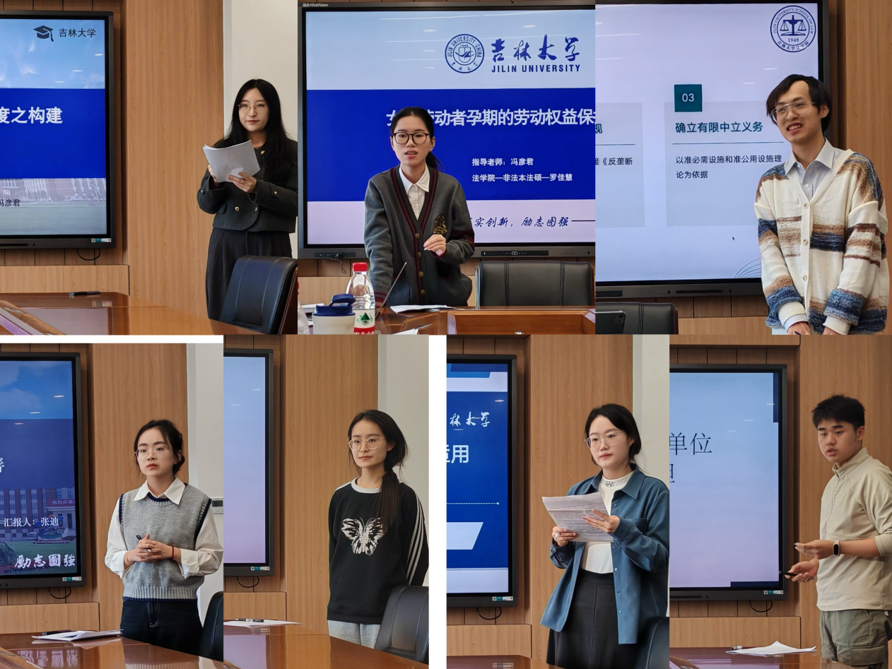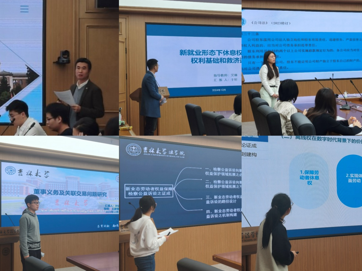 石自国同学以“上市公司非正当关联交易的法律规范——以对控股股东的制约为契入点”为题,于轩同学以“新就业形态下休息权实现的权利基础和救济途径”为题,东芳玉同学以“关联公司法人人格否认规则的司法适用研究”为题,叶逸浩同学以“董事义务及关联交易问题研究”为题,杜鑫瑜同学以“新业态劳动者权益保障检察公益诉讼之证成”为题,吴禹萱同学以“劳动者离线权法律保护研究”为题进行汇报。