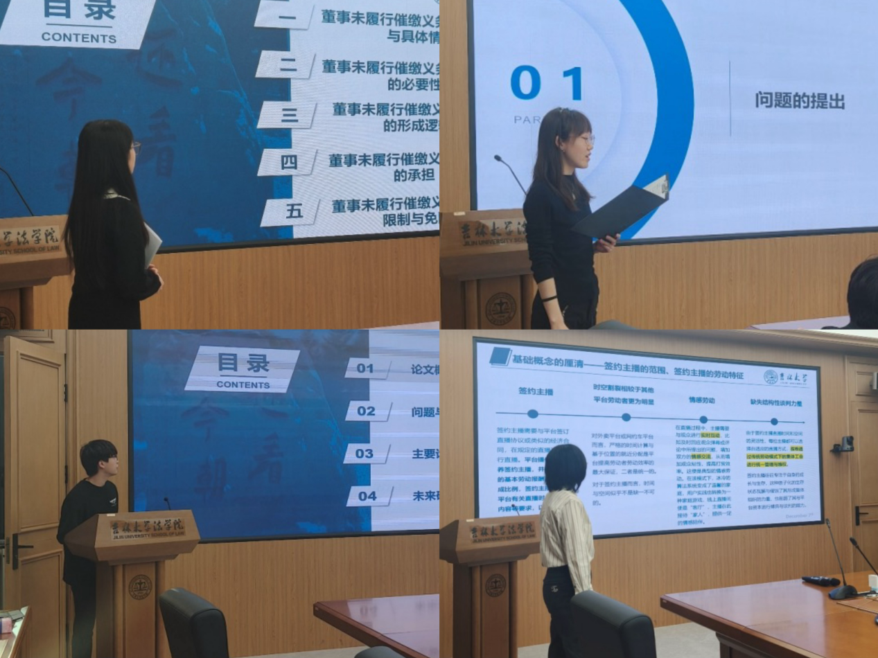 万欣欣同学以“未履行催缴义务董事责任研究”为题,侯丽文同学以“退休权利视角下大龄劳动者就业促进制度优化”为题,呼延家忆同学以“新就业形态劳动者权益保障的检察履职研究”为题,王艺霖同学以“算法控制下签约主播的劳动权益保障研究”为题进行汇报。