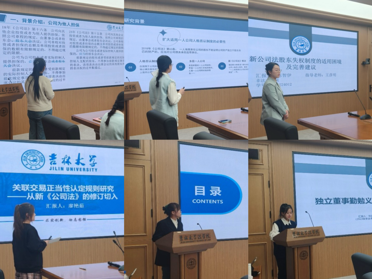 陈佳委同学以“新公司法下法定代表人越权担保效力认定问题探讨”为题,陈露元同学以“一人公司人格否认制度的纵向扩大适用研究”为题,陈智伊同学以“新公司法股东失权制度的适用困境及完善建议”为题,廖艳茹同学以“关联交易正当性认定规则研究——从新《公司法》的修订切入”为题,卢扬同学以“公司机会规则的立法完善研究——以《公司法》修订为视角”为题,张潇桐同学以“独立董事勤勉义务判定标准认定研究”为题,蔡佳诚同学以“人口老龄化背景下退休再就业人员劳动权益保障的现状与优化对策研究”为题,陈一鸣同学以“新业态从业人员多层次工伤保险制度构建”为题,霍艺鑫同学以“远程办公从业者工时权益保障”为题,黎家美同学以“劳动者离线权保护路径探究:以工时制度为视角”为题,宋楠楠同学以“新就业形态下劳动者离线权的建构进路”为题,谢莹莹同学以“新就业形态劳动者的失业保险制度探析”为题进行汇报。