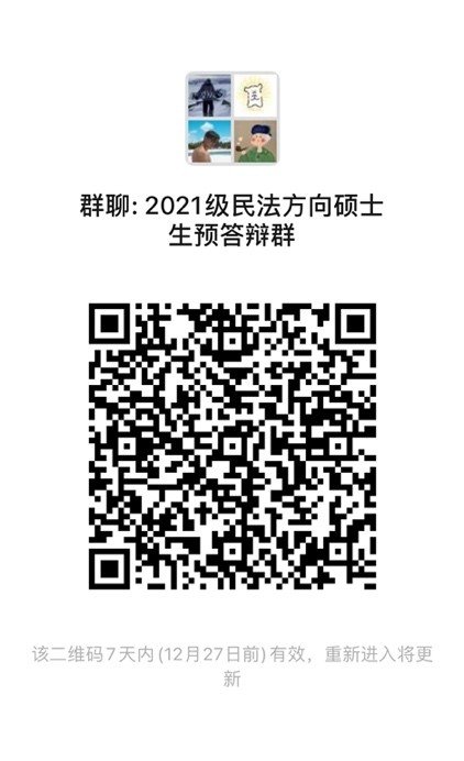请参与本次预答辩的硕士研究生及时扫码入群(硕士生入群后请在“我在本群的昵称”中写明“学硕/法本法硕/非法本法硕+姓名”,如:学硕张三)。