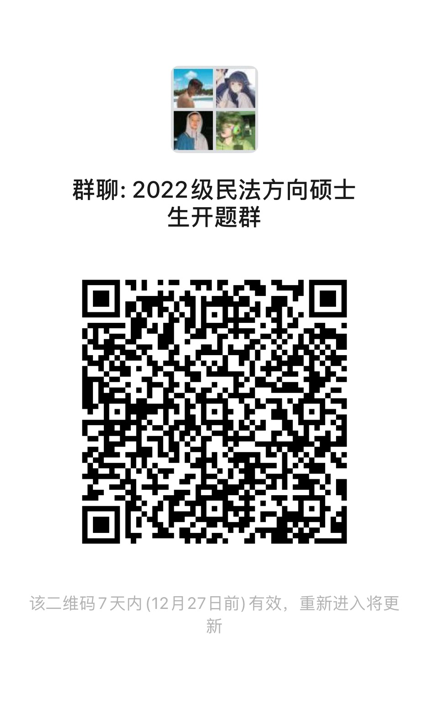 请参与本次开题的硕士研究生及时扫码入群(硕士生入群后请在“我在本群的昵称”中写明“学硕/法本法硕/非法本法硕+姓名”,如:学硕张三)。