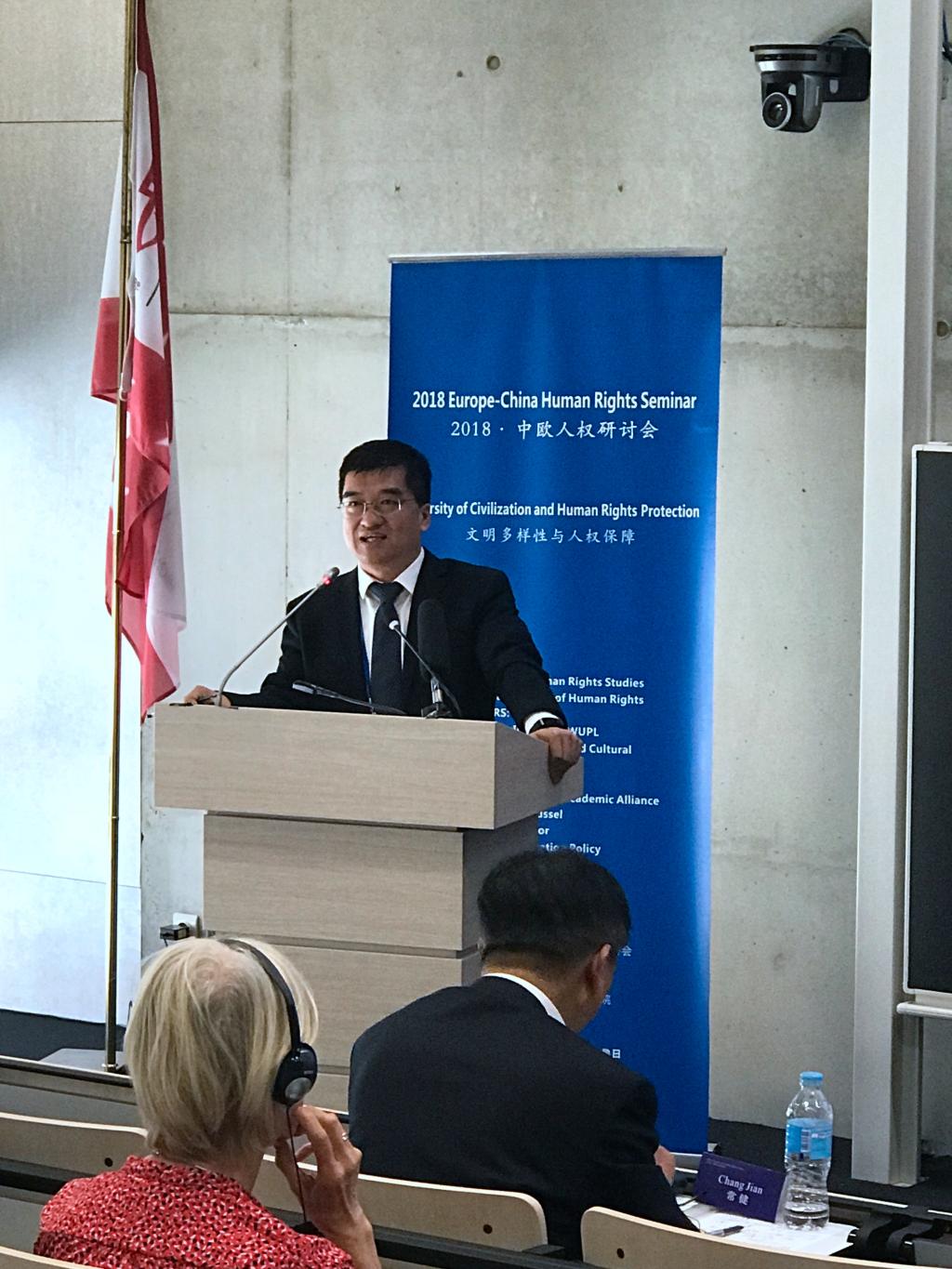 2018年6月28日,由中国人权研究会和国际人权研究院共同主办,西南政法大学人权研究院和法国ADELIE语言与文化交流协会共同承办,法国斯特拉斯堡大学、比利时荷语布鲁塞尔自由大学和欧洲政治和战略交流研究所协办的“2018·中欧人权研讨会”在位于比利时布鲁日的欧洲学院举行。本次研讨会主题为“文明多样性与人权保障”。来自中欧人权领域的60多位专家学者围绕多元世界中的人权理论与实践、东西方人权观念的差异、文明多样性下的人权交流与对话、寻求多元文明的人权共识、文明多样性与《世界人权宣言》等内容进行了讨论。何志鹏教授作为中国人权研究会常务理事应邀参加本次会议,与意大利米兰大学副校长福斯托·卡波尔主持议题一的讨论,在议题二做题为《人权保护中的文化宽容》的发言,并在闭幕式上汇报了议题一和议题二的主要观点。