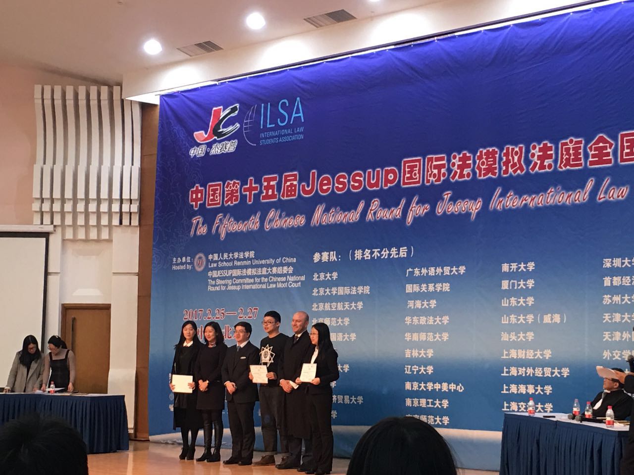 2月25日-2月27日,由中国人民大学主办的第15届“杰赛普(Jessup)国际模拟法庭全国选拔赛”在北京举行。本届选拔赛为期三天,吸引了国内49所高校参加,经过三天的激烈的角逐,我校2013级本科生李正同学获得了赛会的“最佳辩手”(Best Oralist)奖。