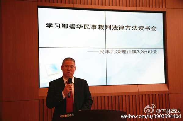 下午继续进行的是法律适用方法实务研讨,主题发言人均是省内各法院一线的法官们。吉林省高院民一庭副庭长姜涛法官首先发言。他提出在一定地域范围内法律职业者应当形成一个职业共同体,因而邹碧华法官的法律适用方法不应当仅仅适用于法官的司法裁判过程,检察官、律师乃至TheGay