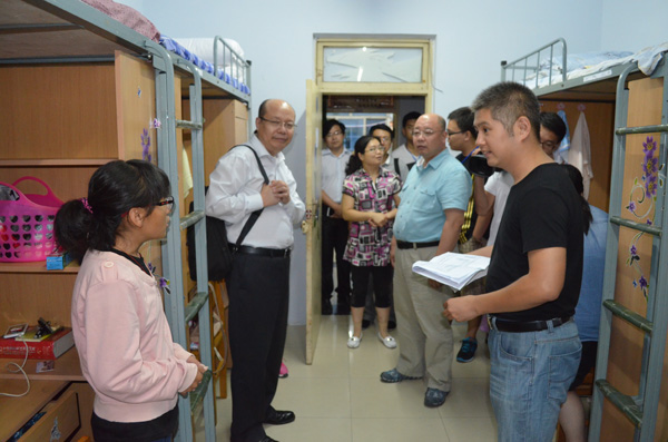 党委书记李洪明,副院长孙学致,副院长张光宇,党委副书记赵洁,团委书记、2014级新生辅导员高岩,2013级辅导员骆旷达一行来到经信三公寓寝室看望2014级的新生们。