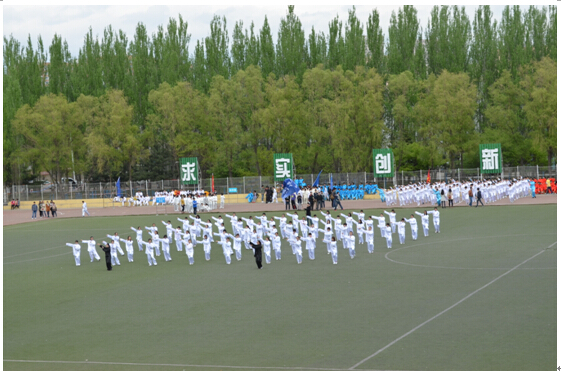 所用学院预检完毕后,由学校统一安排站位,各院以30人为一路纵队,联合成了一个大方阵。千余人的方阵气场,加上各学院不同颜色的武术表演服、不同的彩旗,在体育场形成了一道亮丽的风景线。当真是美不胜收。