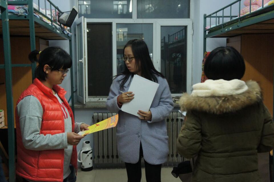 查寝评分细则》井然有序地准时开始查寝工作。此次查寝着重检查电器使用,同时注重寝室卫生,同学们积极配合,室内干净整洁,也没有出现违规用电现象,体现出温馨健康的学习生活气氛。在查访各个寝室的过程中,生管会工作人员分发了消防安全传单,普及了“学生宿舍如何防止用电火灾事故”、“抢救用点火灾事故要注意什么”、“失火后有哪些应急措施”以及“逃生注意事项”四个方面的知识,使同学们对消防安全有了更深入的认识,并得到了同学们的积极响应。