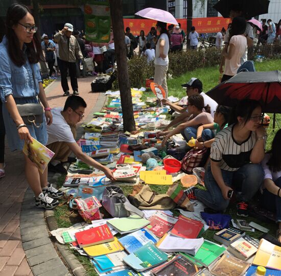2016年6月18日早上七点三十分左右,已有部分2016届毕业生到达了指定地点,选择好位置,摆放好物品,为即将到来的活动做好了充足的准备。八点左右,陆陆续续有同学们到达活动地点,彼此热切地交流着买卖物品的事宜。随着活动的顺利进展,活动现场已经不再只有学校里的学生,还有很多慕名而来的心怀爱心的社会人士,生意也越来越好,体育场的小路上挤满了前来购买的人,场面甚是热闹。很快就到了中午,校区里的人们越来越多,购买的热情也越发高涨,这些即将毕业的学生们忙起来甚至忘记了去吃午饭,但是能够这些收获对他们来说也是值得的。