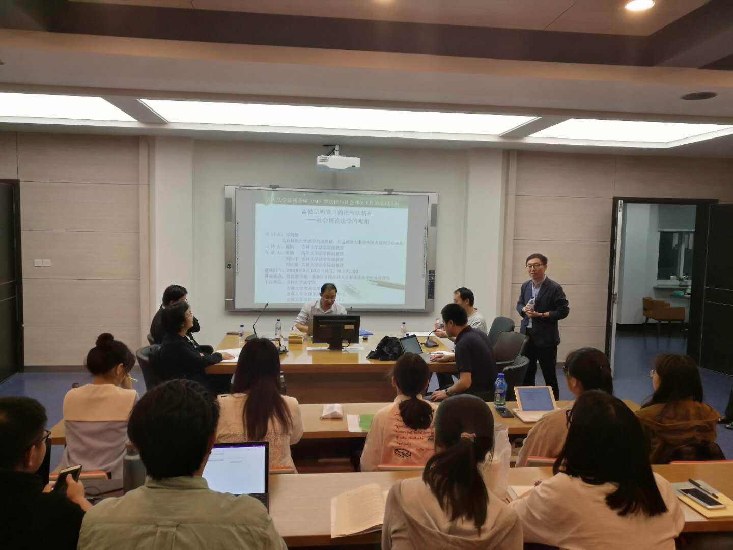 马老师以孟德斯鸠的两句名言作为开场白,首先,介绍了孟德斯鸠所处的社会历史背景以及其主要的作品,强调了多部作品之间在内容上的内在关联;接着,马老师就孟氏法律观之关系论、多元论、世俗论等特征进行了阐释;其次,马老师通过“社会”、“世界观差异”、“世界观相合”以及“时间观”等内容解读了社会理论的一阶观察;再次,马老师从另类的自然法、作为根本“法”的法精神、克制的上帝以及二阶普适性等内容论述了孟德斯鸠的二阶观察;最后,马剑银副教授以社会理论法学研究的三重进路作为结语,对社会理论法学的研究取向进行了简单的总结。