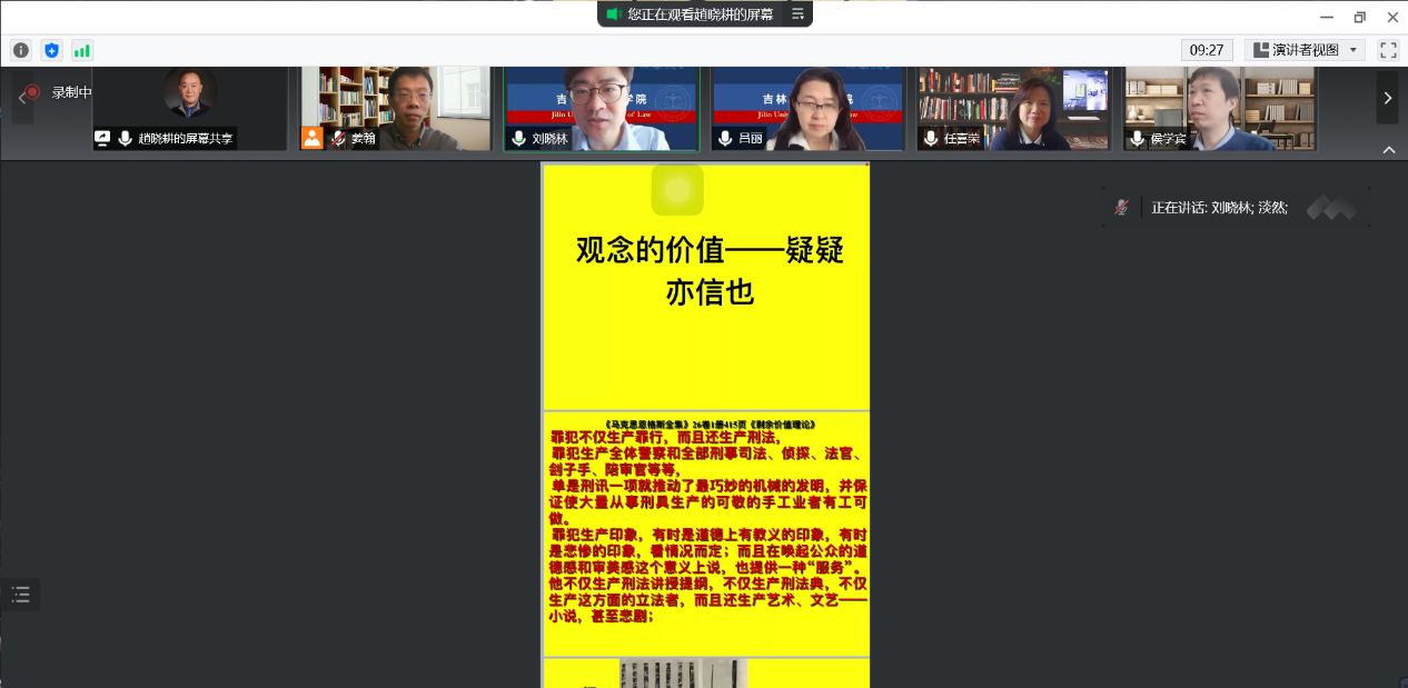 最后,刘晓林教授对此次讲座进行总结。在此次讲座中,赵晓耕教授将“传统法的当代价值”这一宏大话题寓于诸多与生活息息相关的事例之中,图文并茂、深入浅出、娓娓道来,给各位听众以如沐春风般的学习体验和深刻的启发。本次讲座取得了圆满成功。