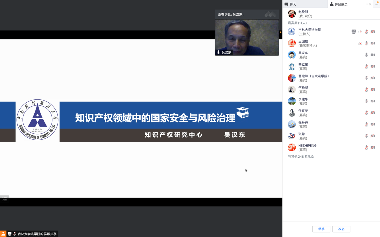 知识产权法学学科的发展,也给予了诸多的提携与帮助。吴汉东教授关于知识产权领域的国家安全与风险治理的高水平讲座,也将给吉大师生带来更多感悟与思考。