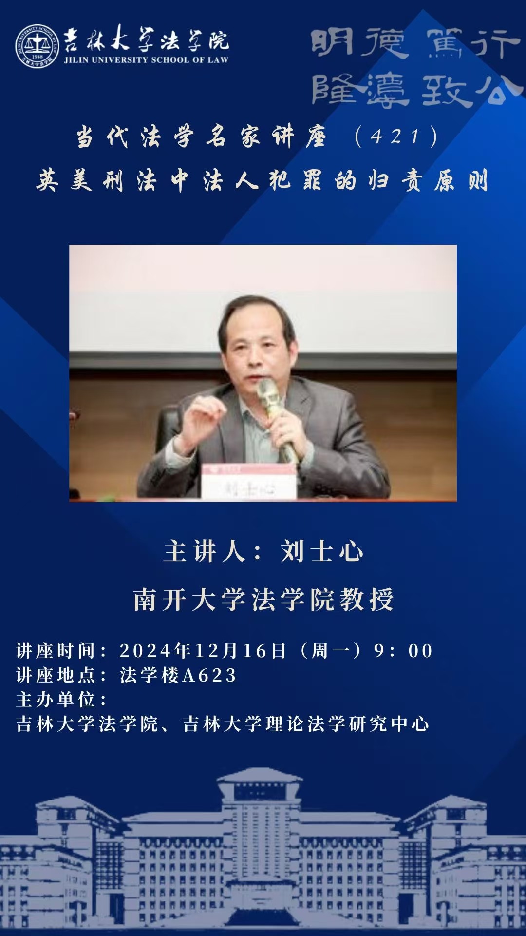 第421期当代法学名家讲座,讲座题目为“英美刑法中法人犯罪的归责原则”,讲座地点在法学楼A723。本次讲座由TheGay