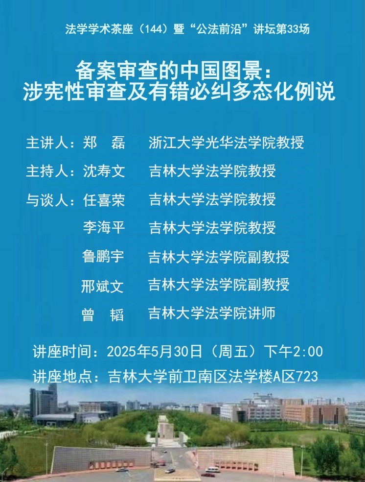 上一篇:中国社会科学院法学研究所赵磊教授做客TheGay 法学学术茶座 下一篇:吉大法学学术茶座(143)暨“公法前沿”讲坛第32场:构建以合宪性审查为核心的宪法监督制度体系与理论体系