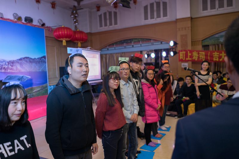 在晚会歌舞表演的过程中,共安排了四轮游戏环节和一轮激动人心的抽奖环节。主持人组织观众席的同学们分为红、黄、蓝、绿四个阵营,每个阵营派出代表进入游戏环节。游戏之初同学们稍显腼腆,随着游戏的展开,逐渐熟络起来,大家争先恐后,一片欢声笑语,气氛热烈而融洽。尤其最后一轮游戏形式新颖,采取男女搭配游戏的方式,场内掌声连连、笑果频频。