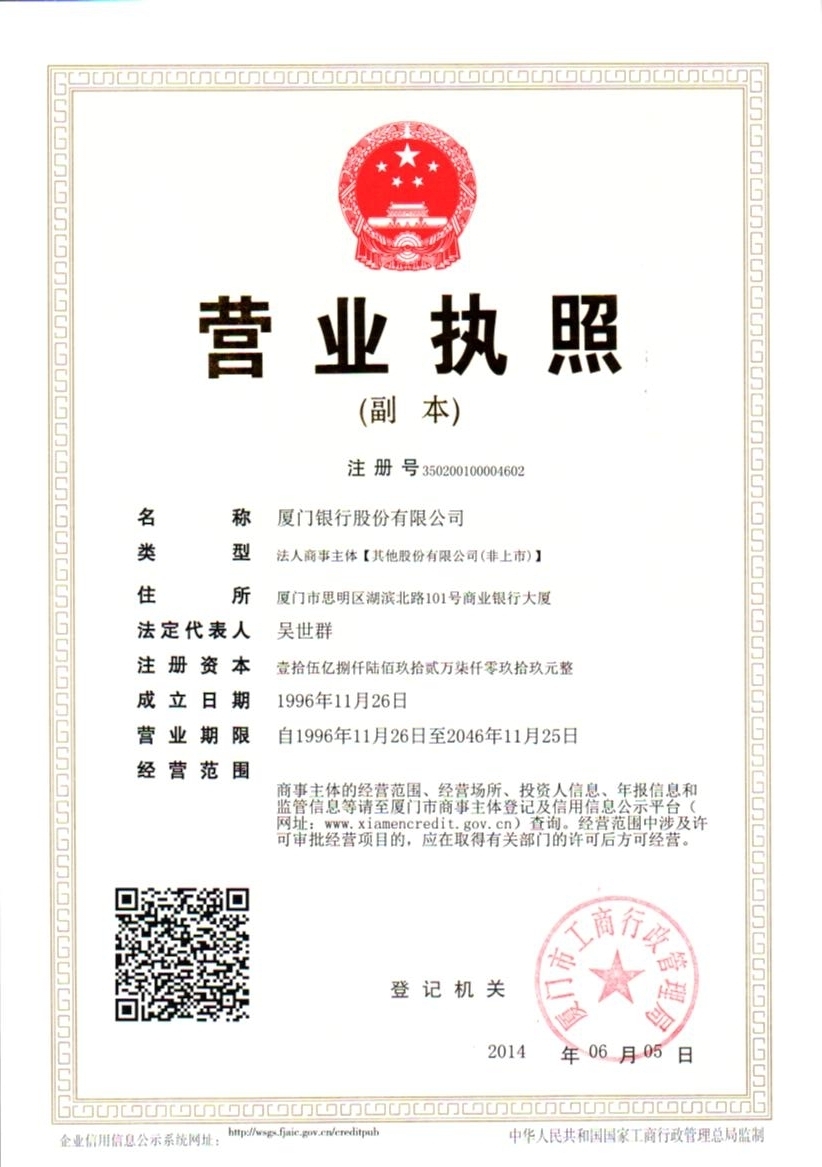 截至2015年底,厦门银行总资产突破1600亿元,监管评级连续多年保持二级,外部资信评级保持AA级。全行现有50多个现代化经营网点、员工近2000人,已在重庆和福建省内九个设区市设立分行,实现福建省内分行网点全覆盖。