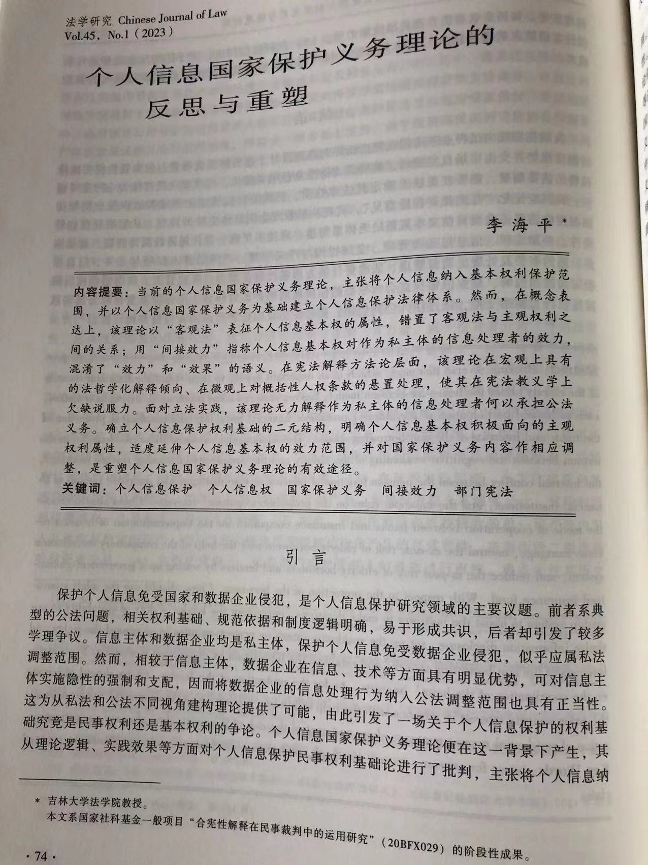李海平教授在《法学研究》2023年第1期发表题为《个人信息国家保护义务理论的反思与重塑》的文章。该文是李海平教授继《区域协调发展的国家保障义务》《基本权利的国家保护:从客观价值到主观权利》等文章后在国家保护义务理论领域的又一力作。文章着力建构中国个人信息公法保护自主知识体系,在分析既有个人信息国家保护义务理论困境的基础上,阐释个人信息基本权国家保护和民事权利国家保护二元结构理论,论述个人信息基本权国家保护的理论逻辑、制度逻辑和制度构成,回应学界关于个人信息国家保护义务理论研究中的争点问题。在方法论方面,该文是从部门宪法学入手深化宪法学一般理论的一次有益尝试。