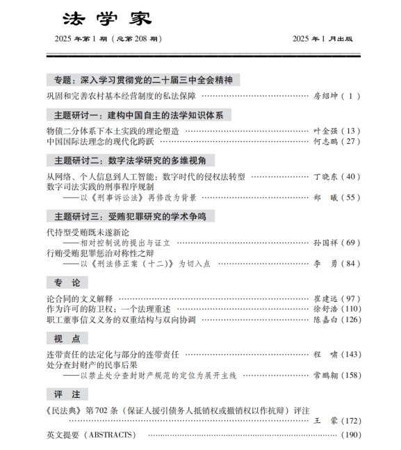 房绍坤教授在《法学家》2025年第1期发表题为《巩固和完善农村基本经营制度的私法保障》的文章。该文是房绍坤教授多年来持续深耕农业农村法治研究取得的又一代表性成果。
