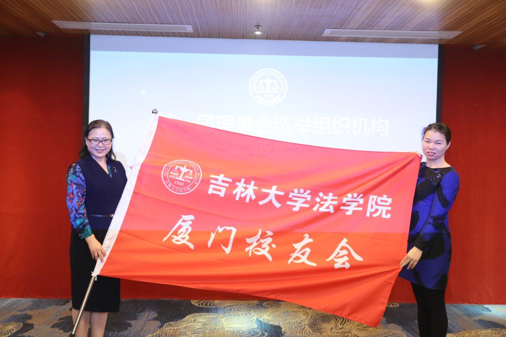 向厦门校友会副秘书长卢玉琼授旗。