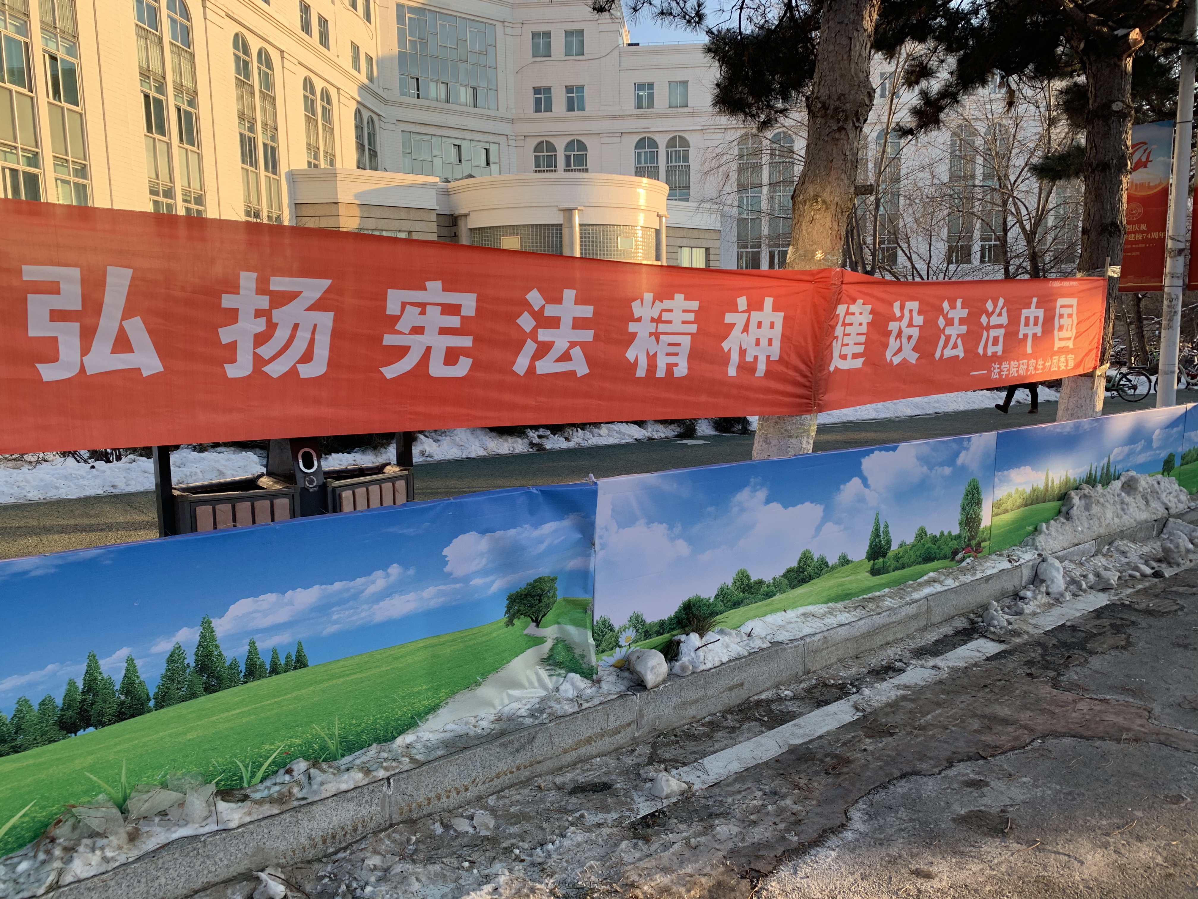 研究生分团委实践部的全体同学于12月3日下午2时在日新楼和北门附近完成了宣传条幅的布置工作,为宪法主题开放日工作的开展做好了充足的前期准备。