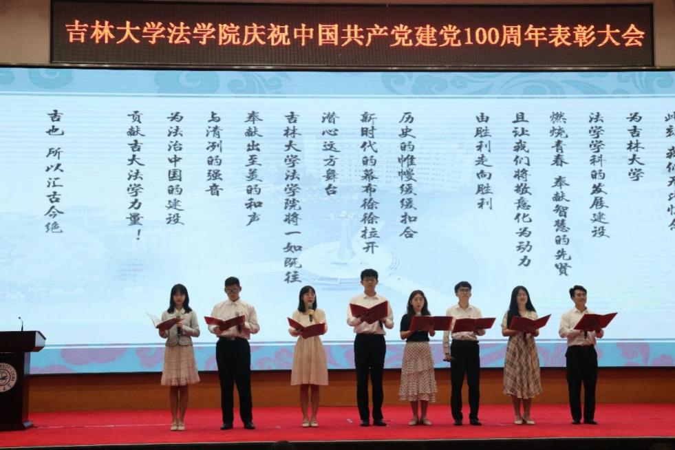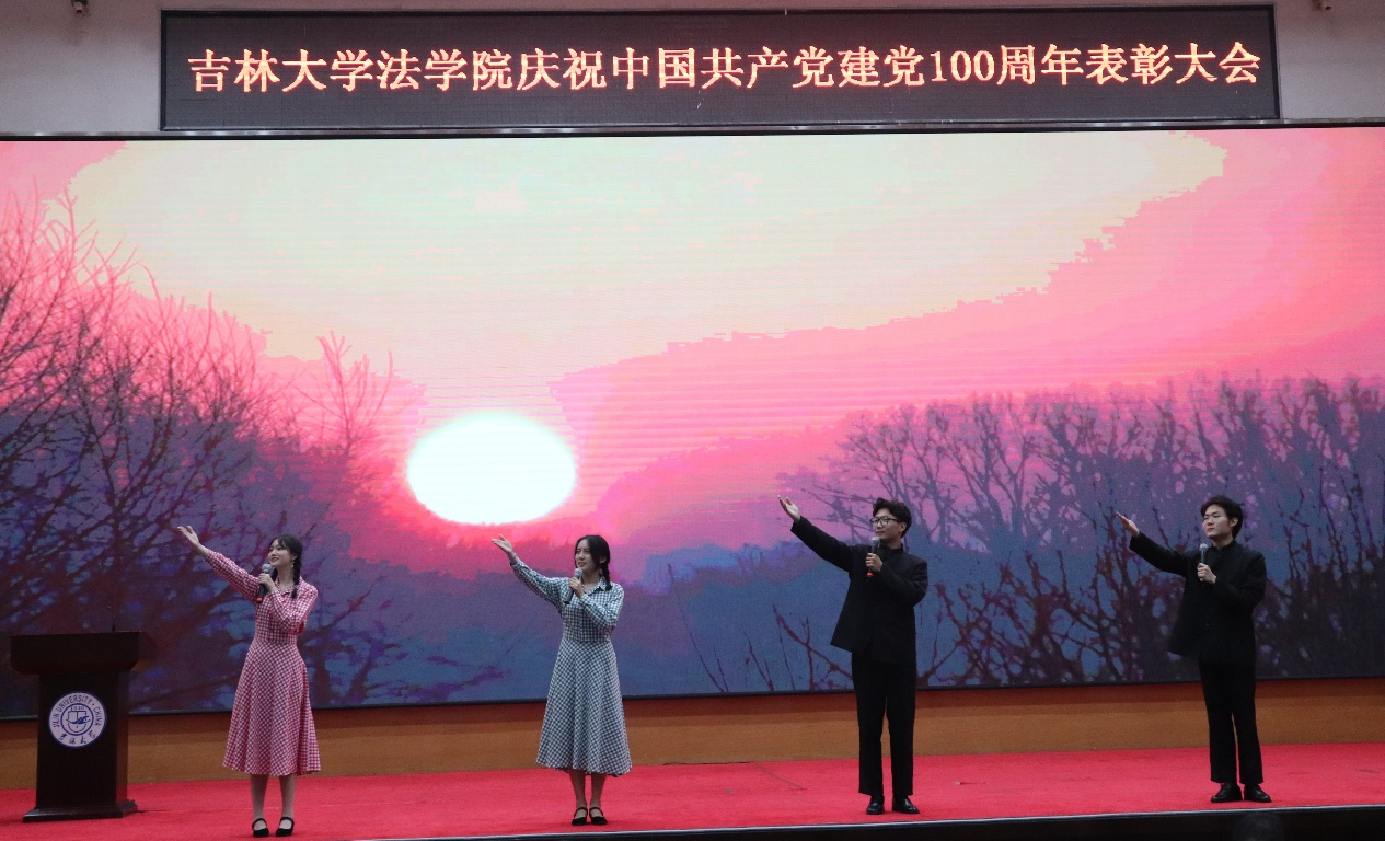 师生通过精心排演的文艺节目向建党100周年献礼。节目按照党史学习教育四个历史阶段,分别以救国、兴国、富国、强国为主题,通过合唱、朗诵、舞蹈等形式表现了新民主主义革命时期、社会主义革命和建设时期、改革开放和社会主义现代化建设新时期、中国特色社会主义新时代的不同特点,结合吉大法学的发展,展现了中国共产党百年历程的伟大与辉煌。