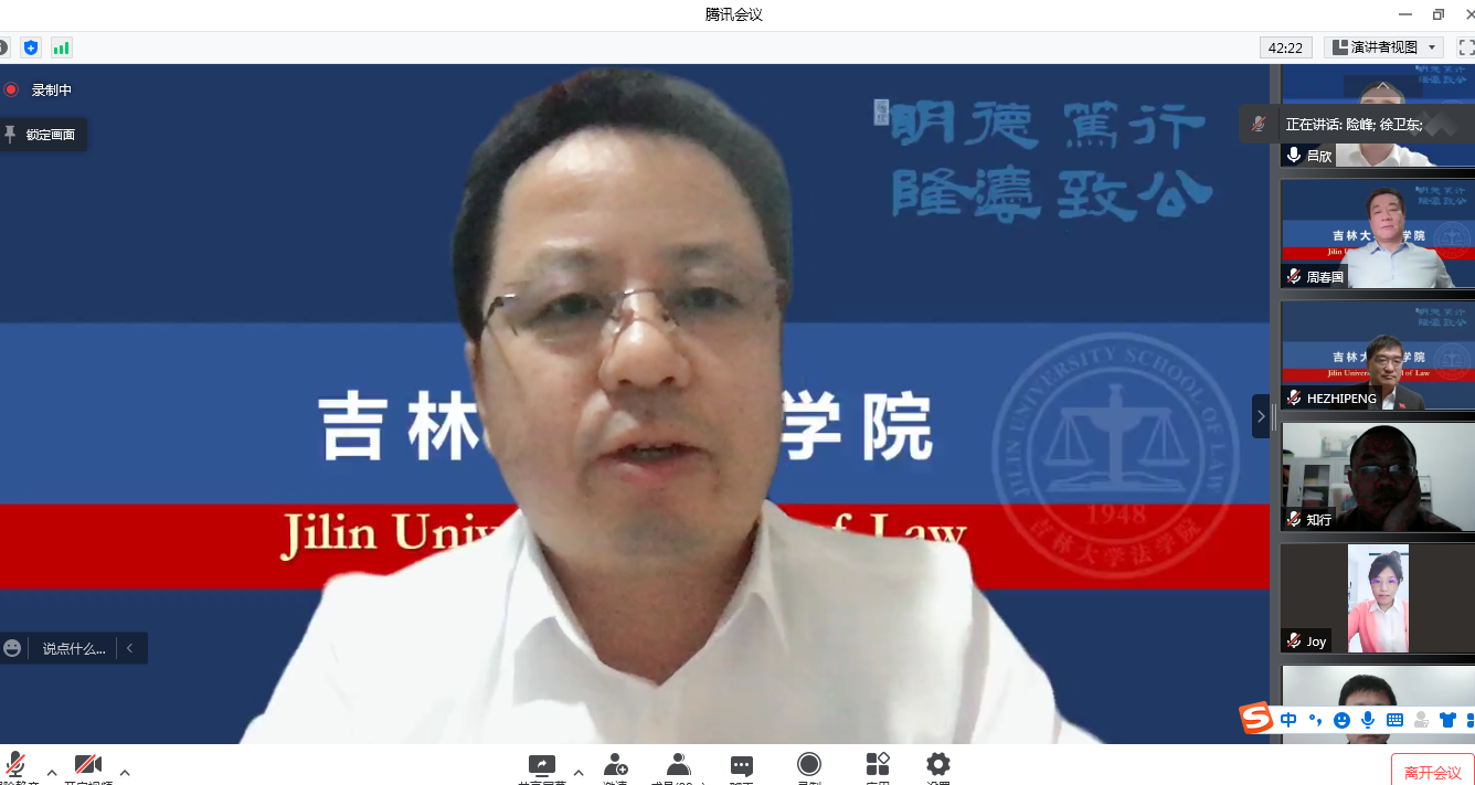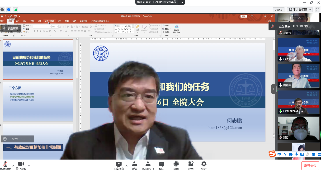 最后,书记周春国通报学校和学院整体抗疫情况,并对当前面临的局势提出进一步工作要求。周春国强调,在抗疫攻坚时期,要举全院之力做好多重保障工作,要多从学生主体的角度思考问题,多从学校全局的角度思考问题,更要坚持实施“四师建设工程”,发挥教师是学生成长导师不可替代的作用。具体而言,一要做到“一定要上好课”,用高质量的课堂教学和老师的学术魅力吸引学生,通过名师讲座等让学生有获得知识的成就感。二要做到“一定要引好路”,立德树人,德法兼修,要在课堂上实践课程思政,激励学生找准人生的方向,换种角度,将封寝也视为一种修行。三要做到“一定要爱好生”,研究生导师和本科生导师要了解学生所需,反映学生诉求,力所能及地帮助学生解决实际问题,加强亲学关系。四要做到“一定要带好头”,教师党支部要带头做好主题党日;老师个人要带头做好及时关注和反馈学院的工作安排,坚持实事求是地做好每日健康打卡;行政人员要带好头,做好管理和老师们服务保障工作,做好安全防火;辅导员要和老师们保持沟通,必须做到底数清楚,做到一人一策,一个不落。周春国嘱托全院教师,一定要与学生们同心、同向、同行,共同努力,用温情和付出打造吉大法学家园共同体,用真诚和爱陪伴学生们走过这段艰辛的心路历程。
