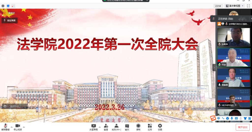 院长何志鹏聚焦学院发展,从三个方面明确学院面临的形势与面对的任务。第一,要有效应对疫情防控非常时期,做到非常态与常态的平衡,理解各级防控政策,保证自己和身边人员的身心健康,保持教学、研究、管理工作的常态运行,加强对学生的引领与关怀。第二,要积极把握学院与学科发展的外部条件,争取国家方面和学校方面的支持,拓展学院建设的资源与契机。第三,明确学科建设与发展的基本方向,勉励传统优势学科和新兴学科坚持深耕,齐头并进,及时调正个人科研研究方向、问题,与吉大法学、地区、国家研究方向和精神对标对表,体现出鲜明的优势和特色。