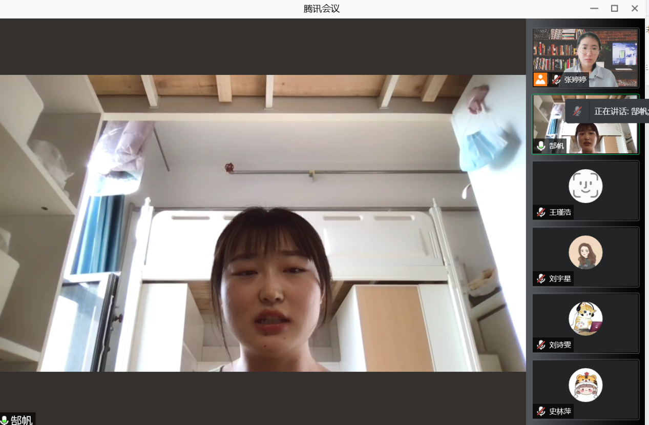 朱明慧同学是第二批加入志愿服务队伍的,她主要给大家讲述了在疫情防控期间,她作为一名同学感受到的来自志愿者和学校的温暖,从检测到凌晨的医护人员,到一日三餐的供应;从努力满足学生需求的老师,到辛勤付出的志愿者,一场疫情让她感受最多的感动。