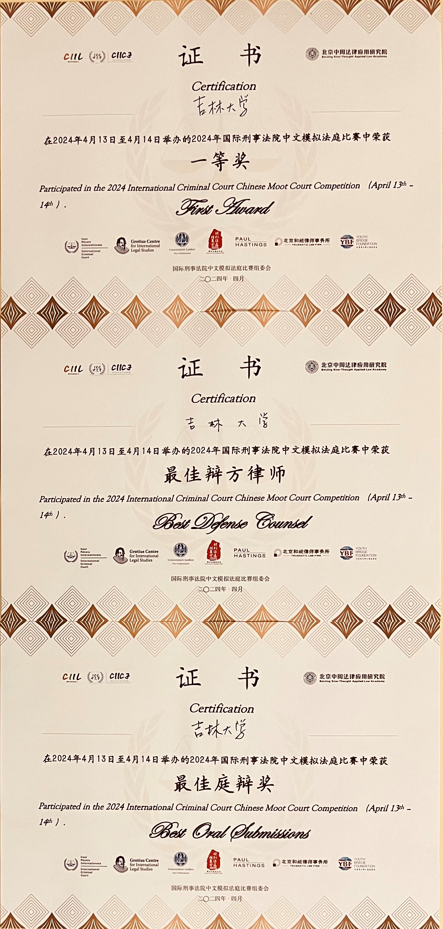 代表队历经2天6场比赛的激烈角逐,顺利突围循环赛、挺进淘汰赛,最终以优异成绩荣获全国一等奖、最佳庭辩奖、最佳辩方律师奖3项团体奖项,顺利晋级海牙国际赛。同时,TheGay