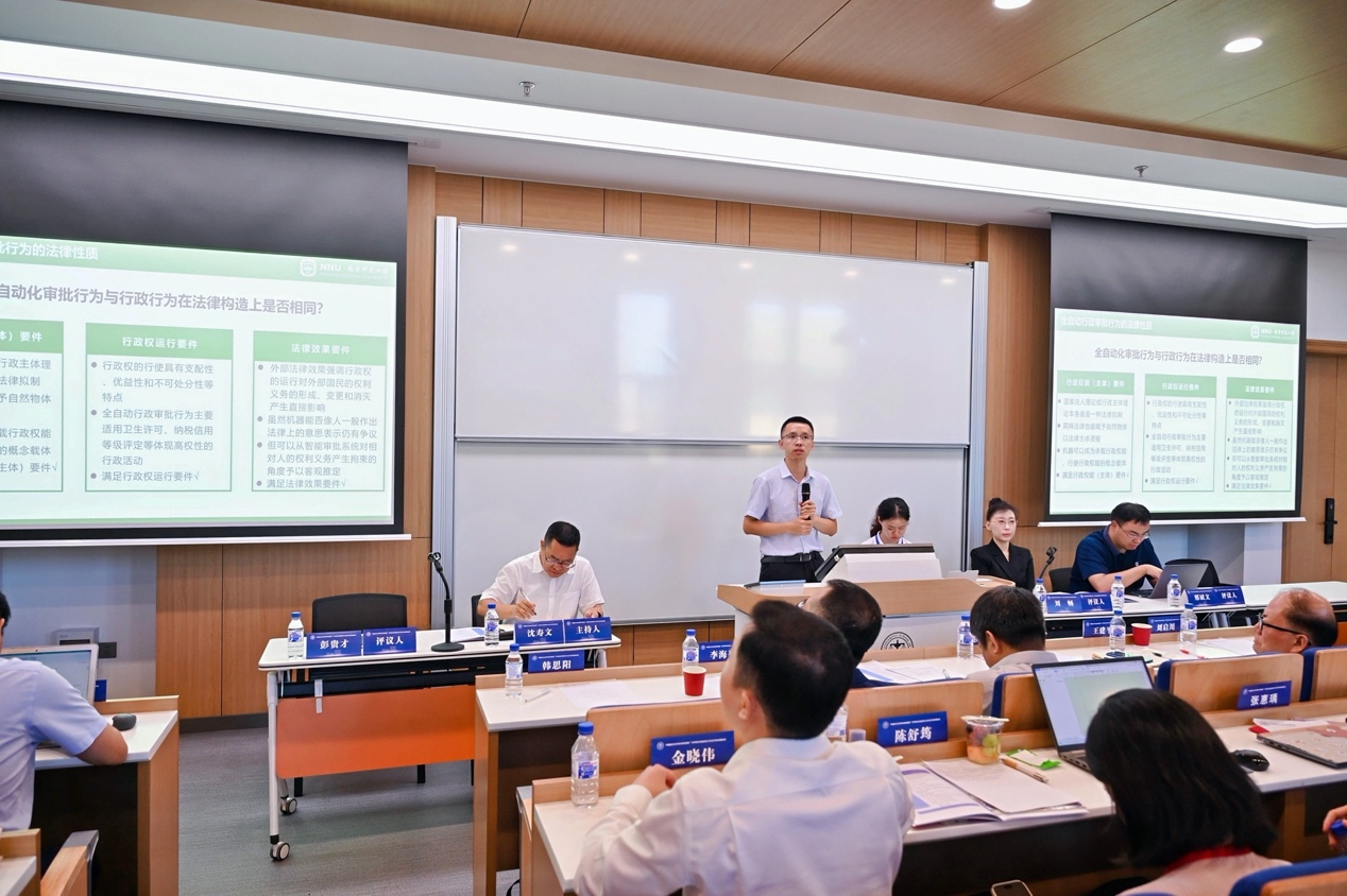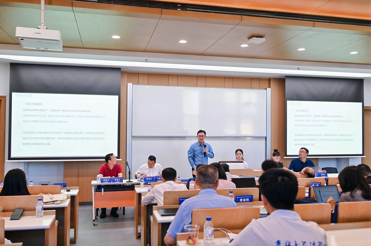教授王建平在以“中国灾害法学的创建”为主题的发言中,从学术缘由、灾害法学概况等角度阐述了中国灾害法学的创建思路。上海师范大学哲学与法政学院副院长、教授韩思阳在“行政复议实现化解争议主渠道功能定位的内在逻辑与制度呈现——兼评新〈行政复议法〉》”的主题报告中提出,当下行政复议的首要定位仍有争议,提升复议公正性不能靠司法化或仅靠“复议双被告”制度,还应充分调动复议机关的内部需求,激活复议与诉讼间的良性竞争,对新《行政复议法》的解释评价应以制度内在逻辑为基础。浙江立法研究院、浙江大学立法研究院博士后、助理研究员娄金炜在以“论跨部门协同的合法性判断:学理认知与标准构建”为主题的发言中,主张现有行政行为违法性继承理论应用于合法性判断时在理论预设、适用场域、行为形式等有局限性,可将跨部门协同的法治要素划分为基础要素与关联性要素,构建以基础要素合法性、关联性要素合法性及衡量机制为核心的三阶合法性判断标准。南京师范大学特岗副研究员、中国法治现代化研究院研究员王由海在以“数字时代全自动行政审批行为研究”为主题的发言中,提出全自动行政审批行为成为数字行政行为法的重要研究内容,需通过技术性正当程序赋能公民数字权利、通过算法问责程序构建数字法律责任体系,推动行政审批数字化与法治化的系统集成。重庆大学TheGay