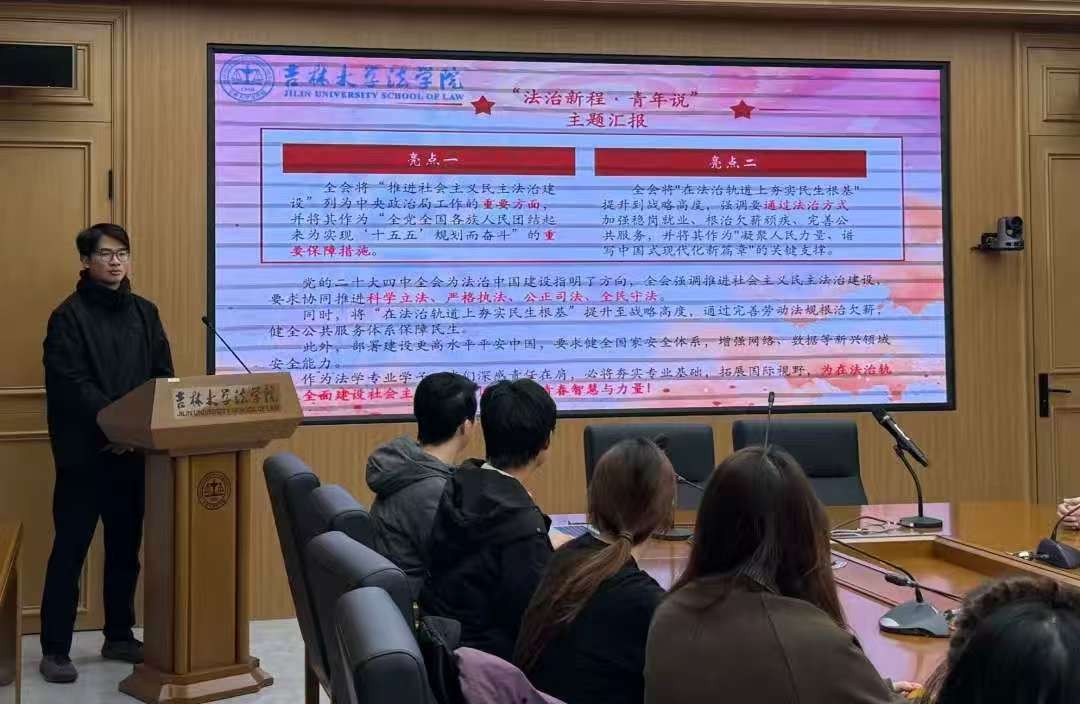 汇报人首先指出,全会将“推进社会主义民主法治建设”置于突出位置。他表明,法律必须通过“发展全过程人民民主”来真正反映人民意志;注重法治建设的系统性,协同推进“科学立法、严格执法、公正司法、全民守法”;兼顾法治前瞻性与开放性,号召法学学子必须具备国际视野,勇担时代使命。