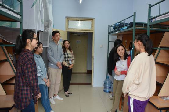 党委副书记兼副院长林媛媛老师、学生工作办公室主任马旭老师、团委书记骆旷达老师以及2018级辅导员于洋老师对大一新生寝室进行了走访。本次寝室走访旨在了解大一同学们的住宿情况和实际需求,帮助18级新生同学们更加快速、顺利地适应大学生活。