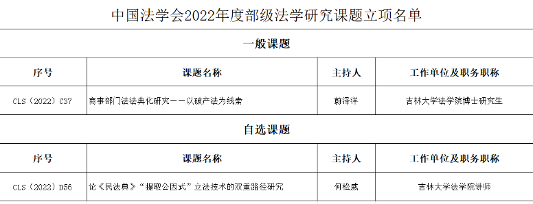 2位师生喜获中国法学会2022年部级法学研究课题立项。其中,何松威老师主持的《论〈民法典〉“提取公因式”立法技术的双重路径研究》获自选课题立项、博士研究生蔚泽洋主持的《商事部门法法典化研究——以破产法为线索》获一般项目立项。